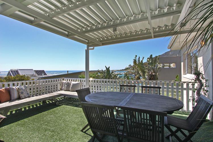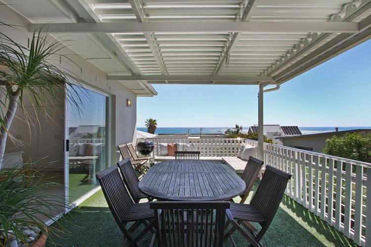 The spacious lounge and dining room area includes a flat-screen TV with full DSTV bouquet. This area opens onto the expansive terrace that has an adjustable slatted roof cover and offers panoramic sea views.