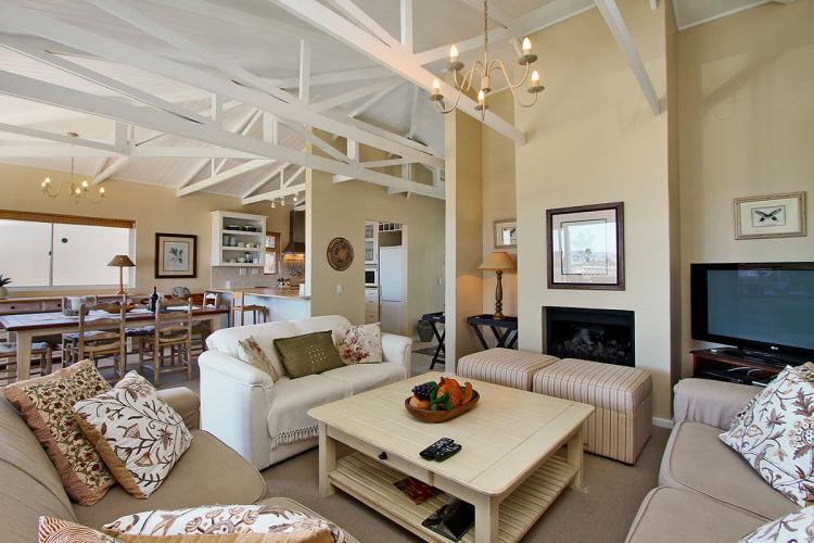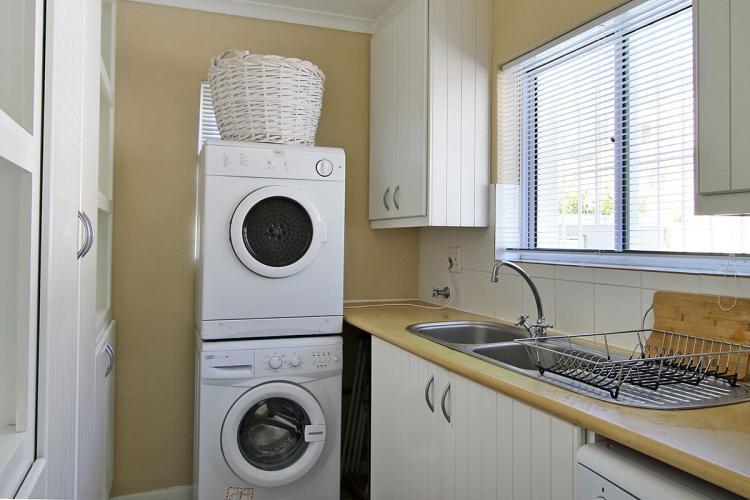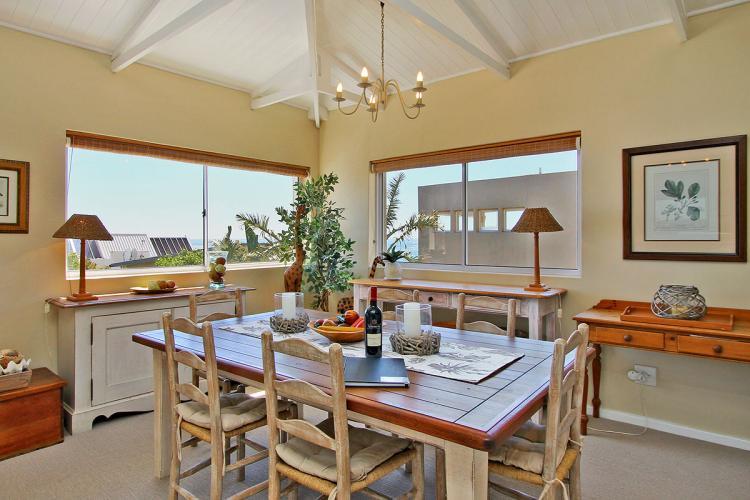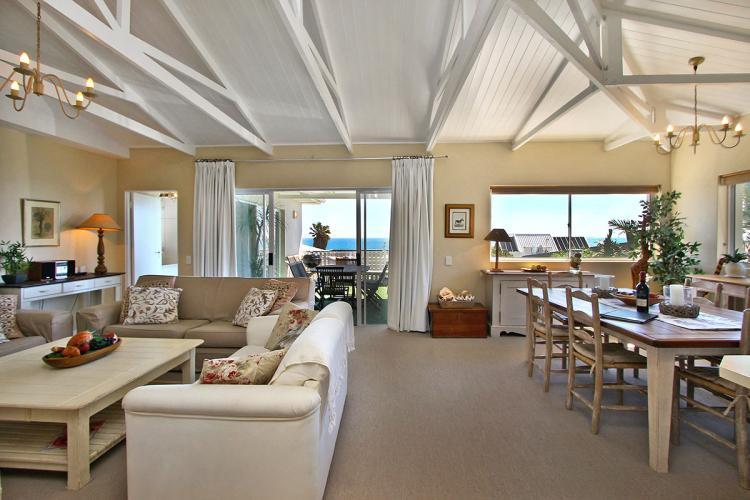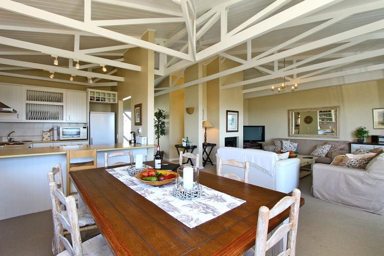 Enjoy beautiful sunsets at the outdoor eight-seating dining table. The lounge and dining room area are tastefully furnished and incorporate a six-seating dining room table. The kitchen is fully equipped to meet your self-catering needs including a separate scullery with washing machine and tumble dryer. There are lovely mountain views from the scullery and bedrooms surround.
