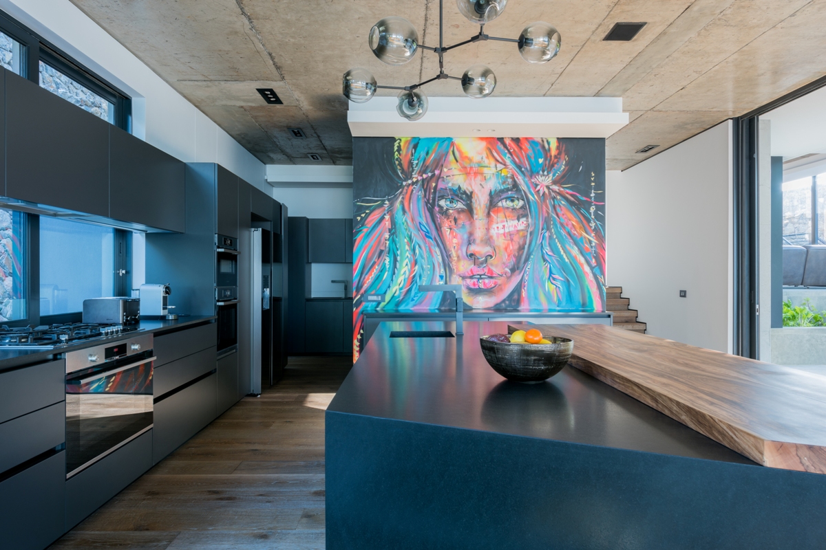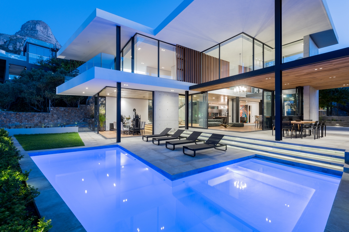 This four bedroom en-suite villa is set over 3 floors with an additional self-catering flatlet. The design combines industrial elements such as raw steel, timber floors and concrete complimented by colourful curated art pieces and custom designed furniture. The centrepiece of the home and pièce de résistance is on the second level which hosts the entertainment area where you will find , the pool, garden, braai area and a centralised custom built double volume courtyard with a tree for added privacy.