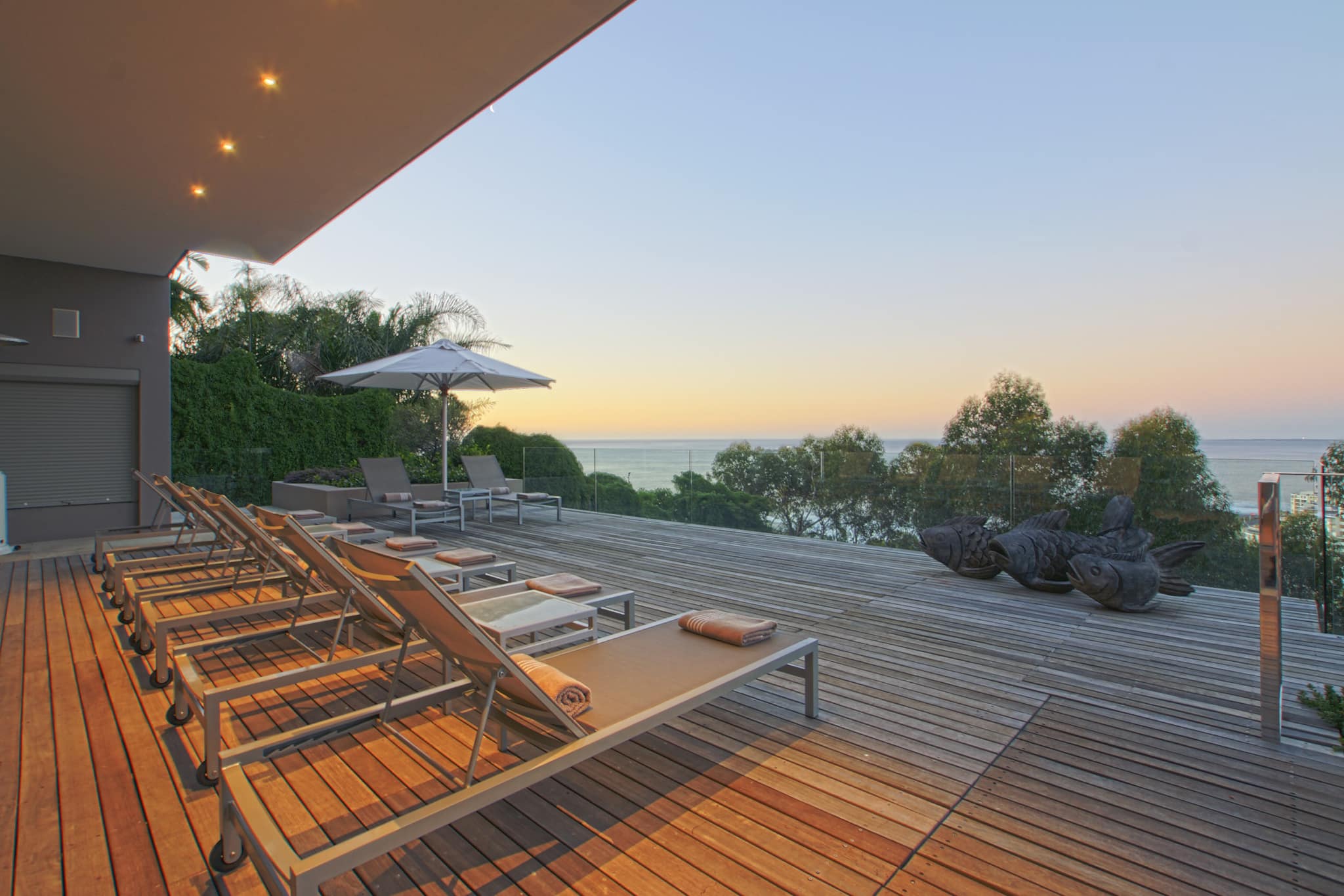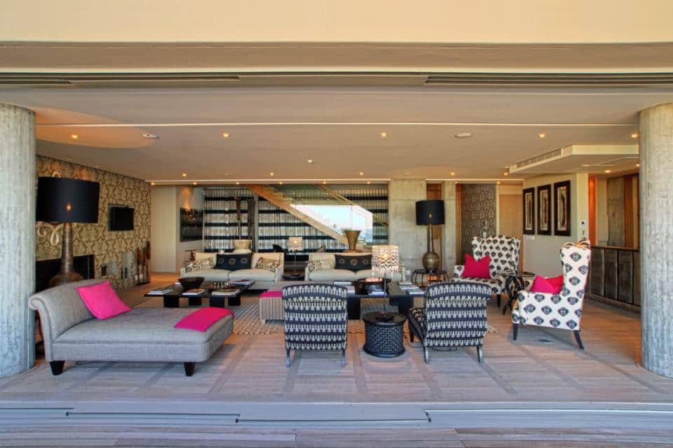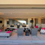 The main living area is located on the first floor, with a self-catering and chef’s kitchen, formal dining room with seating for 12 guests and a large TV lounge with a fireplace. Step outside and relax on one of the lovely outdoor sofas, or dine alfresco while you watch the sunset. The second bedroom is also on the first floor, it has a queen-size bed, en-suite with double vanity and doors onto a balcony with glorious sea views.