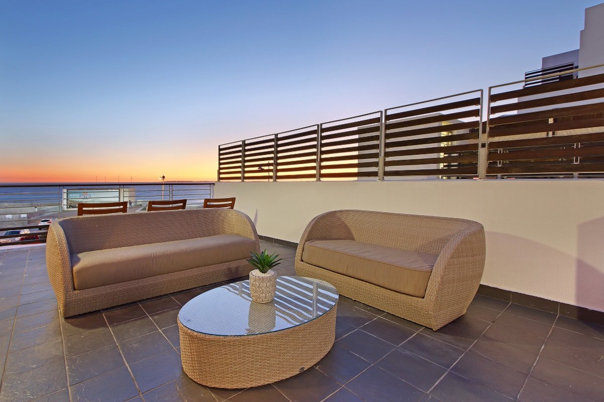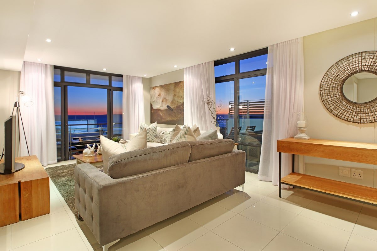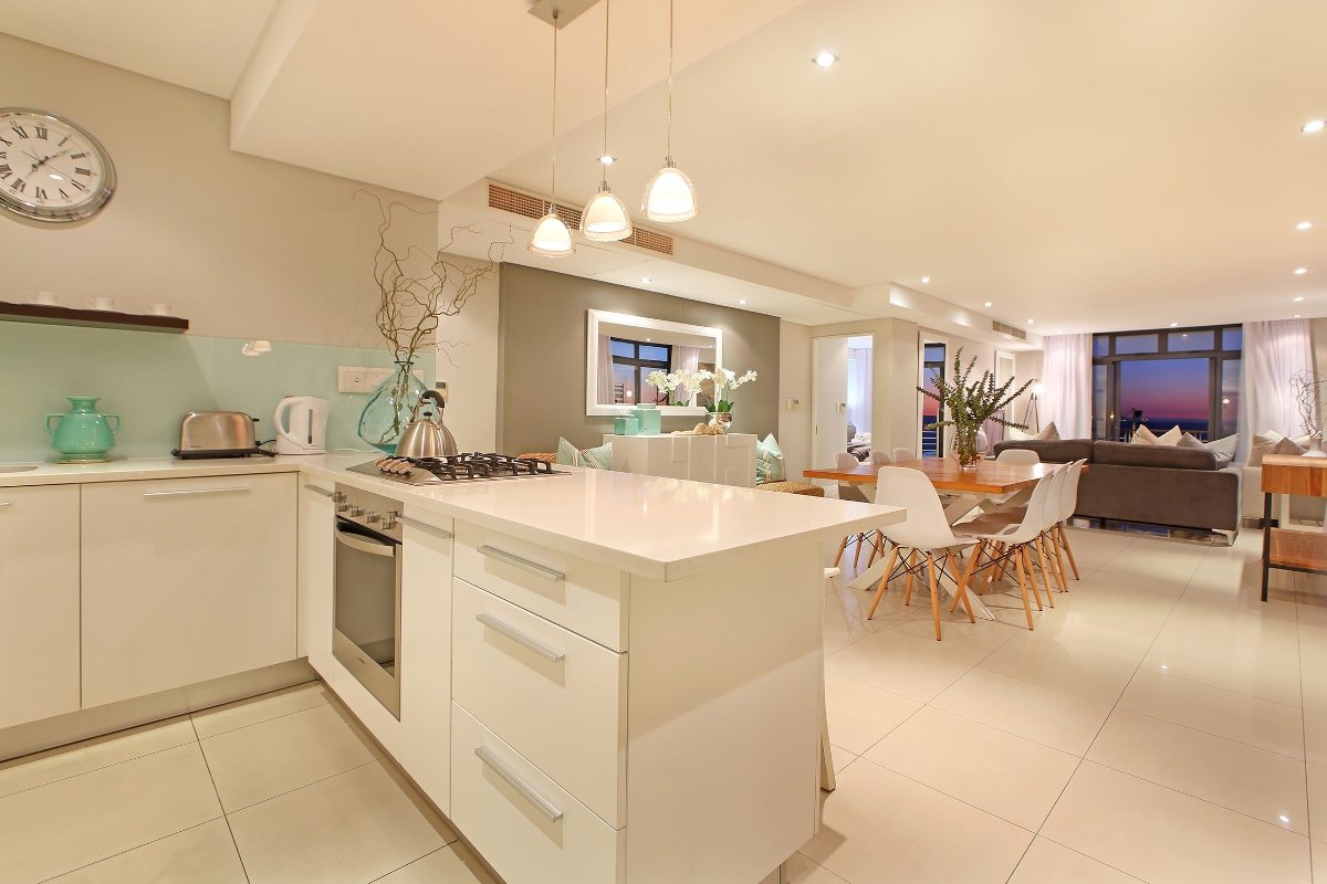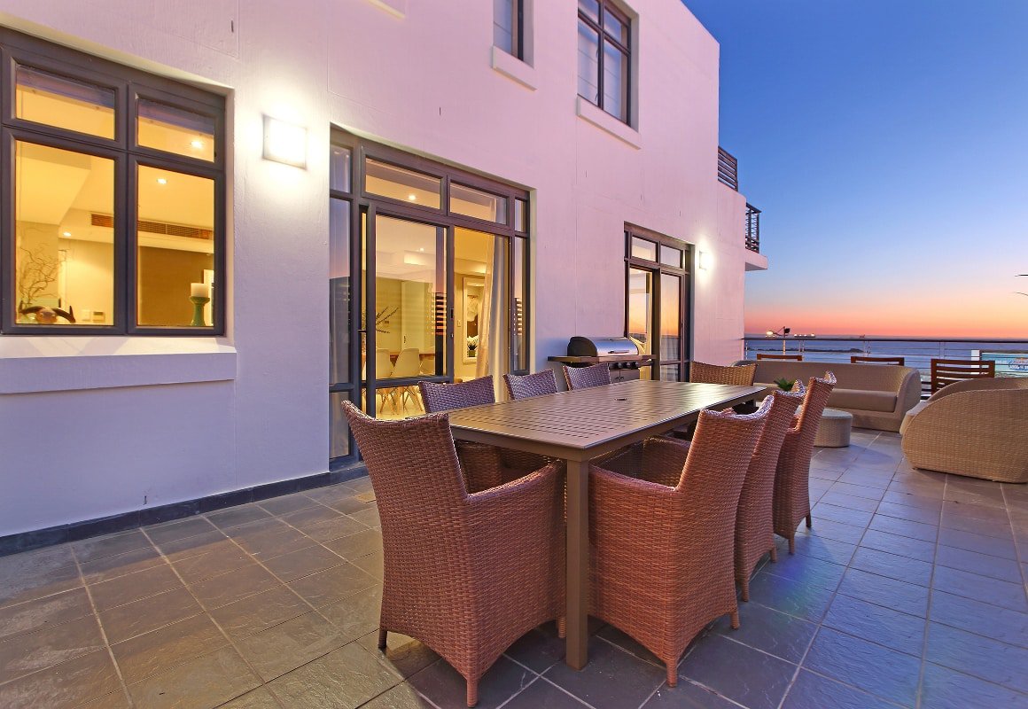 The spacious dining area seats 8 around a long, polished table and the lounge, with ample and luxurious seating features a flat-screen TV and offers a gorgeous view of the Atlantic Ocean. The lounge and dining area furthermore lead out to a balcony, well furnished with lounge and dining furniture and including a barbecue facility, ensuring a relaxing time outdoors.
