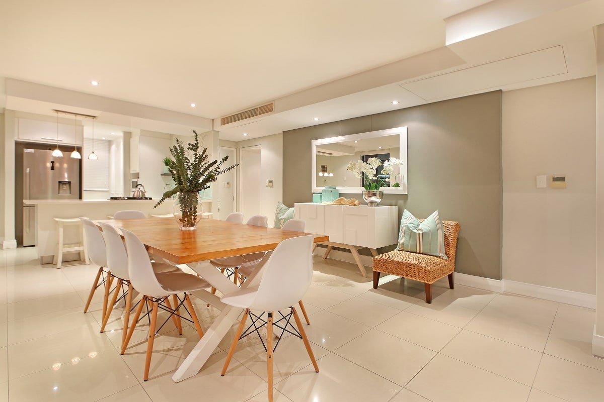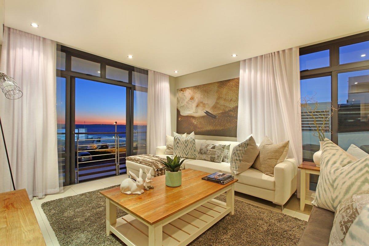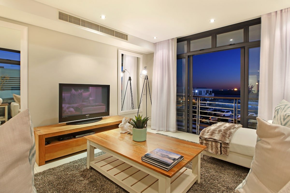 The spacious dining area seats 8 around a long, polished table and the lounge, with ample and luxurious seating features a flat-screen TV and offers a gorgeous view of the Atlantic Ocean. The lounge and dining area furthermore lead out to a balcony, well furnished with lounge and dining furniture and including a barbecue facility, ensuring a relaxing time outdoors.