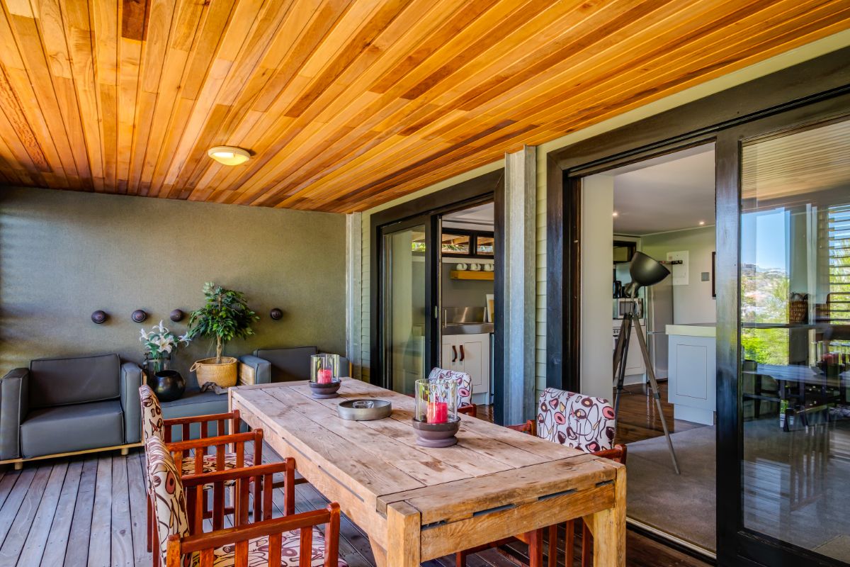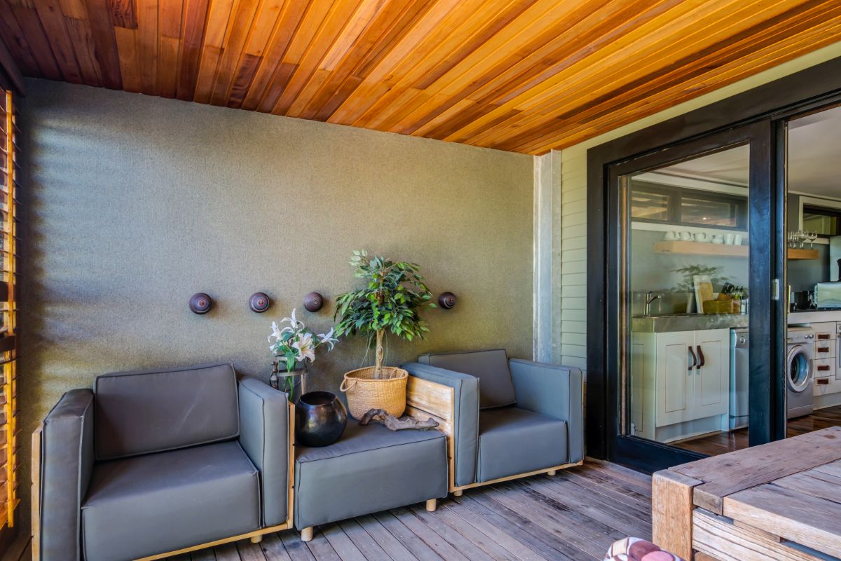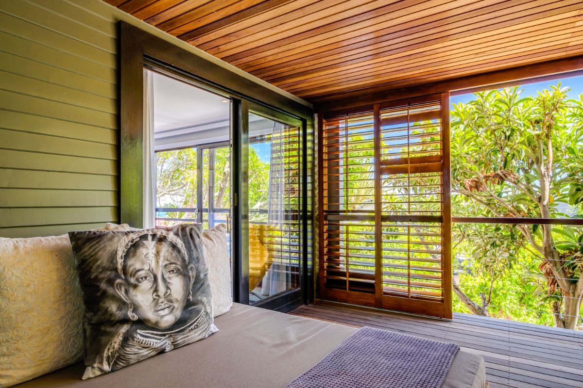 The apartment enters into a spacious lounge. An open plan kitchen adjoins the living room and is well equipped. This area opens up onto a protected balcony which is shadowed by a huge tree, enhancing the feeling of privacy. The balcony features a long dining table and day bed.