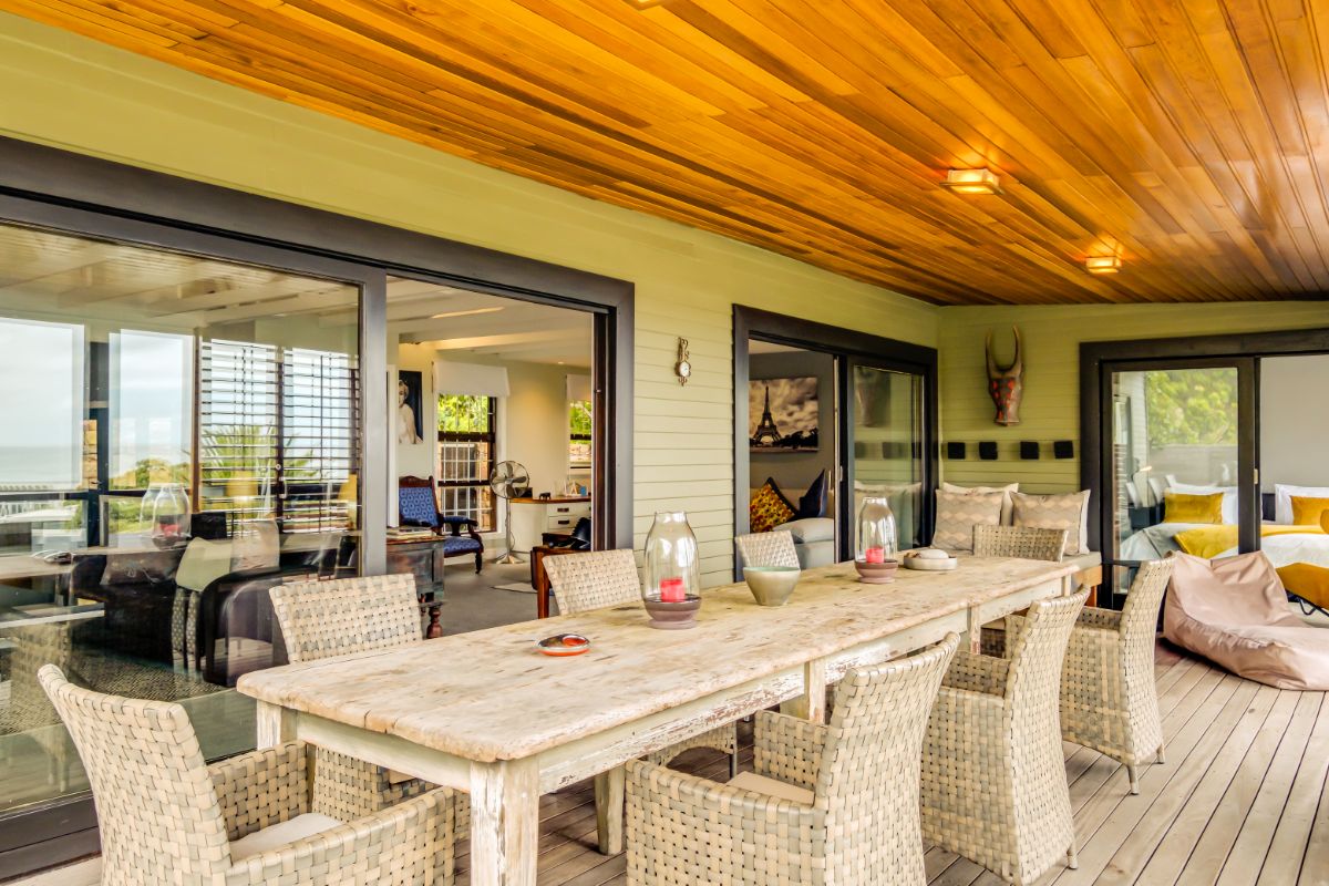 The spacious living room offers a flat screen TV with satellite bouquet. The living area opens up onto a protected wooden balcony, which can be partially closed off by custom American shutters. The balcony has a large dining room table as well as a day bed from which to enjoy ocean and mountain views. A private swimming pool is set into the balcony.