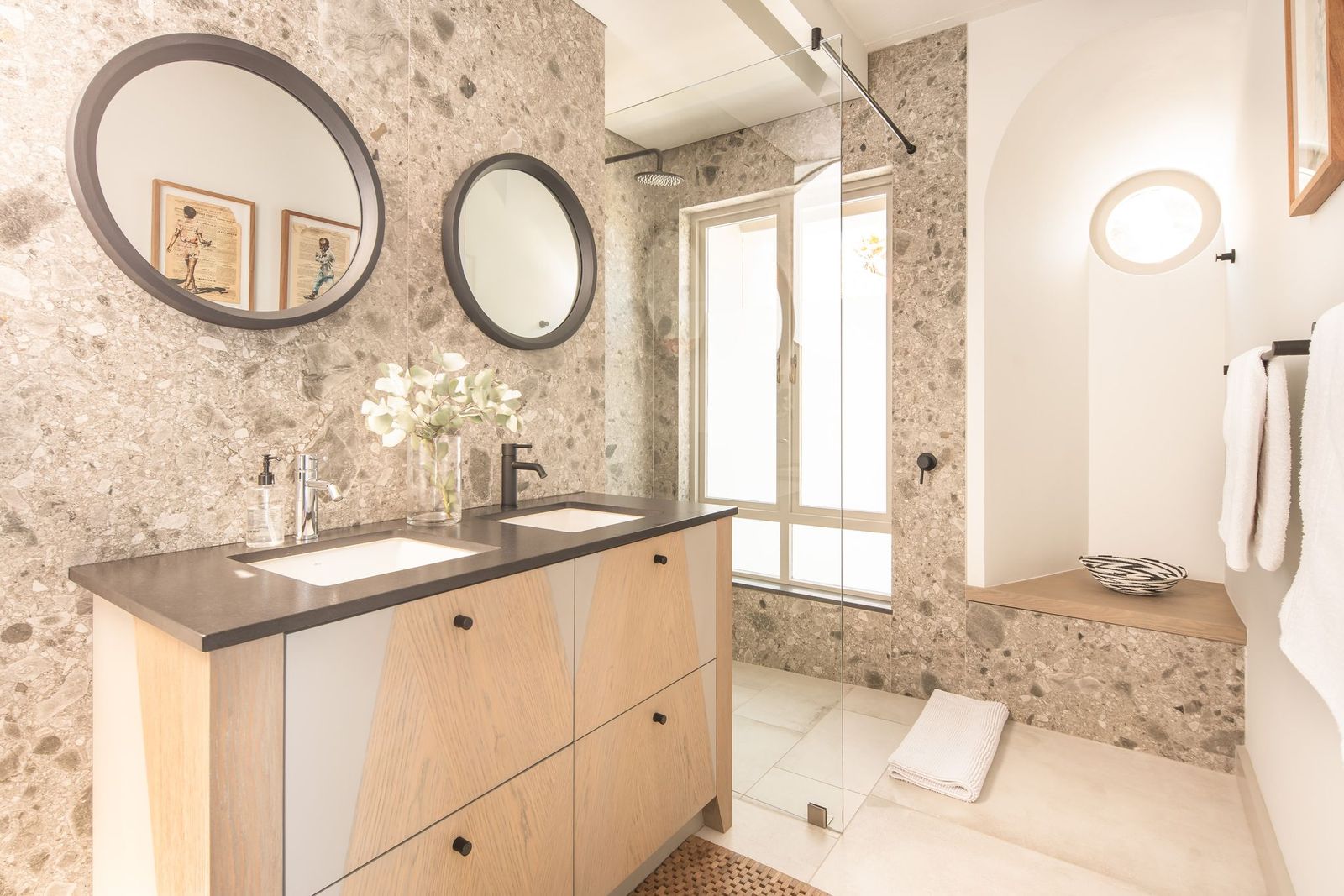 Each of the bedrooms has been decorated with its own theme, from monochromatic to a bright 60’s inspired room, they are all welcoming and comfortable. The master suite has a King-size bed, en-suite bathroom, balcony access with sea views and a sitting area with a fireplace. The second bedroom has a King-size bed, balcony access with sea views and shares the family bathroom. Bedrooms three and four also have King-size beds and share the family bathroom, while the fifth bedroom has an en-suite. All beds can be changed into twin beds upon request.