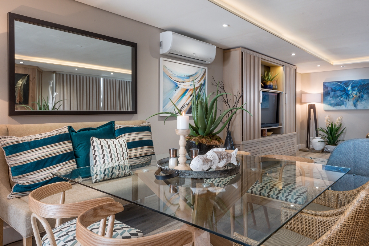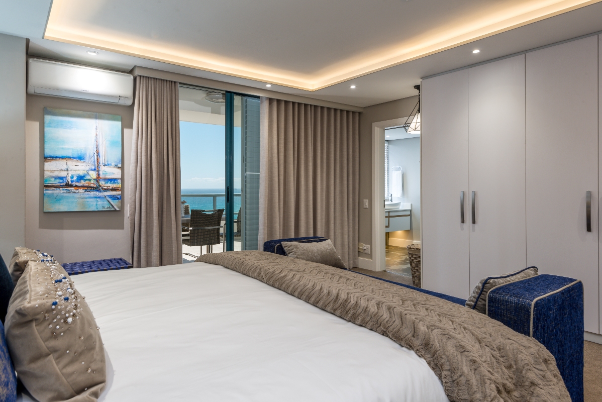 As you enter the apartment, the passage to the bedrooms is on your left. The main living area is open-plan and spacious and has air conditioning. This room offers great views and light and comfortable spaces to relax. There is a fully equipped kitchen is next to the dining area which has seating for 6. From the dining area, the lounge space has plush seating. There is access to two balconies from this room.