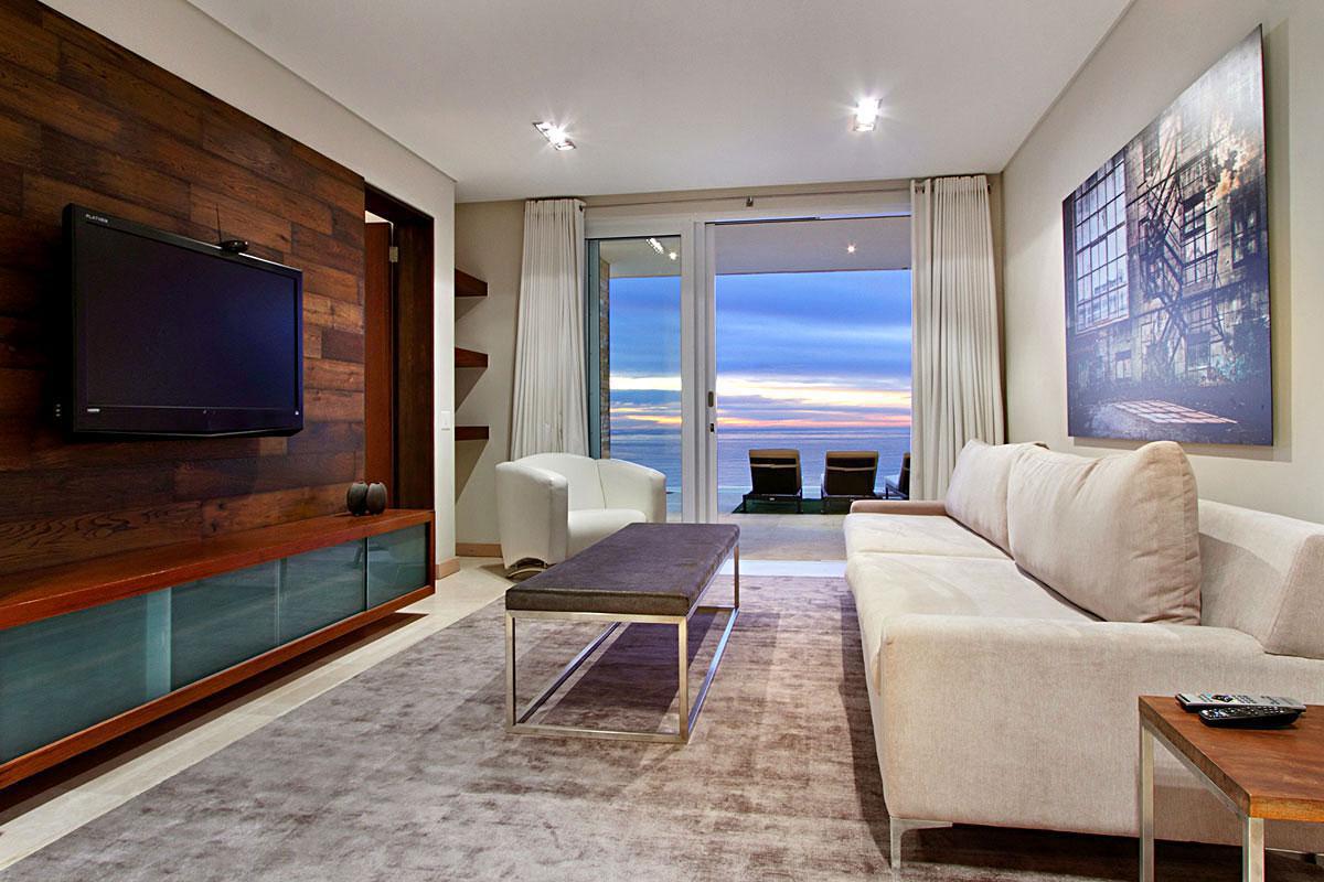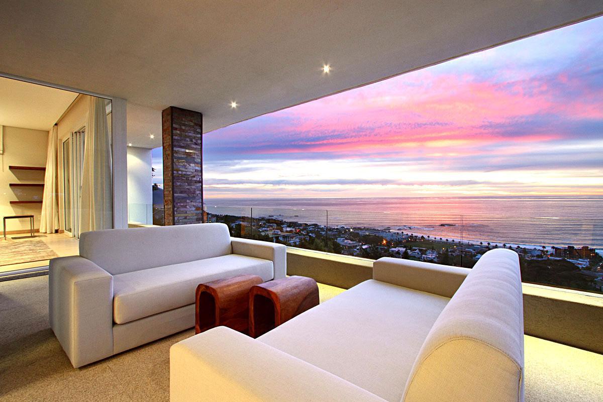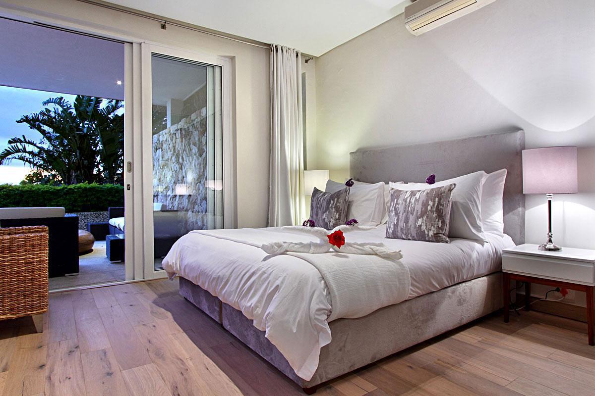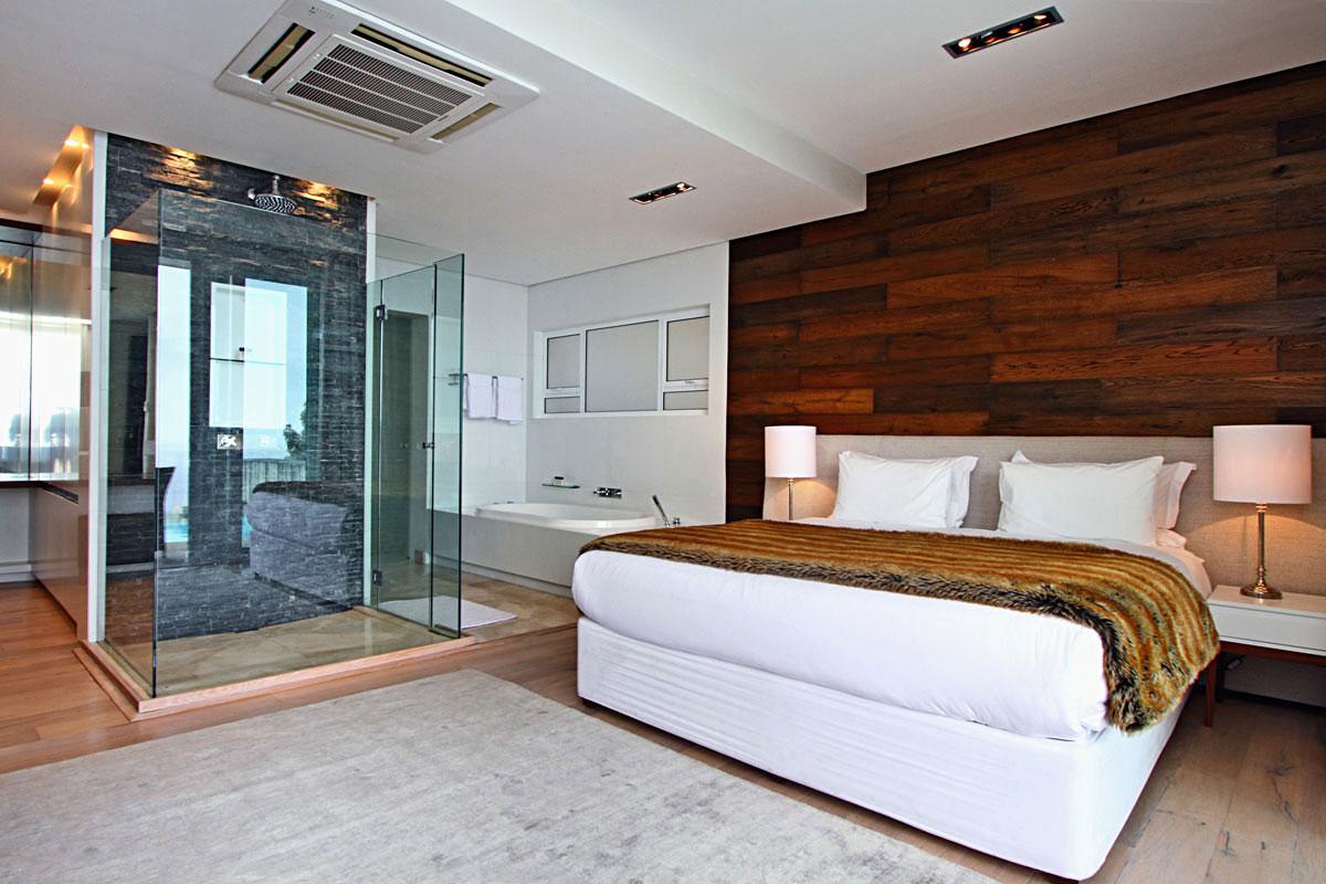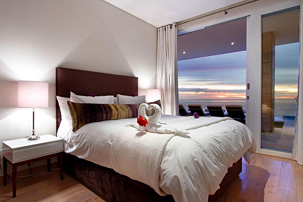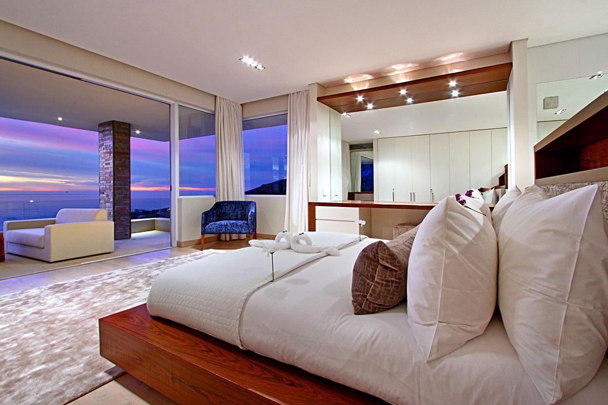 The top floor entrance of Adara welcomes with a sophisticated cocktail lounge area and sweeping views of Camps Bay. The magnificent master suite is located to the right of the cocktail lounge and to the left is a second en suite bedroom complete with private balcony.