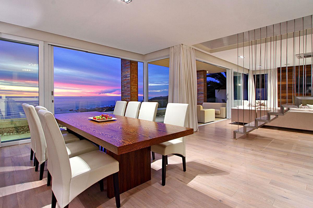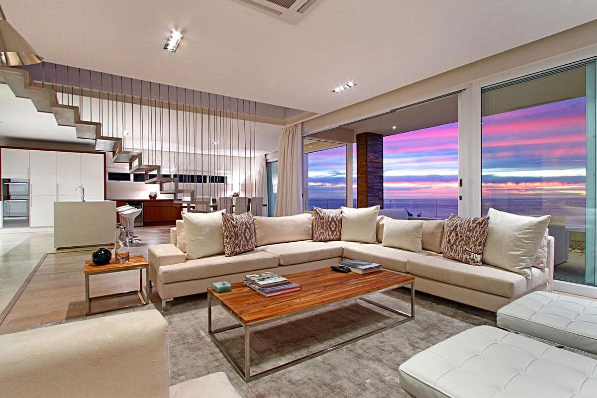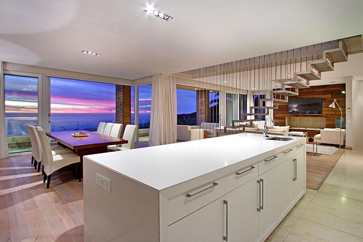 Adara is an exceptional modern masterpiece comprising 3 light filled levels, perfectly positioned on the slopes above Camps Bay. Each level has a terrace complete with beautiful outdoor furniture from which to enjoy spectacular ocean views from sunset to sundown. Adara’s incredible vistas can be enjoyed from every room in the house no matter where one chooses to relax.