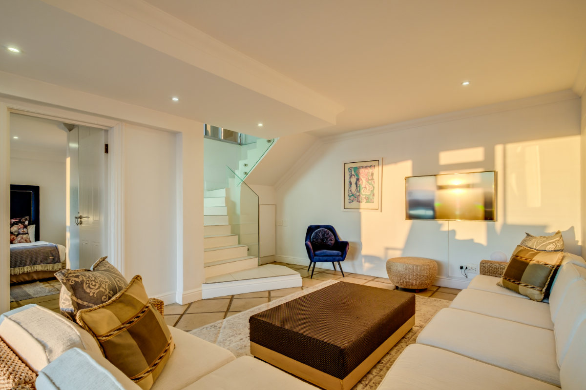 On the middle level is the main open plan living & dining area which leads onto a wrap-around balcony with gorgeous views of the Atlantic Ocean. The kitchen is modern and open plan. There is also a TV room on this level.