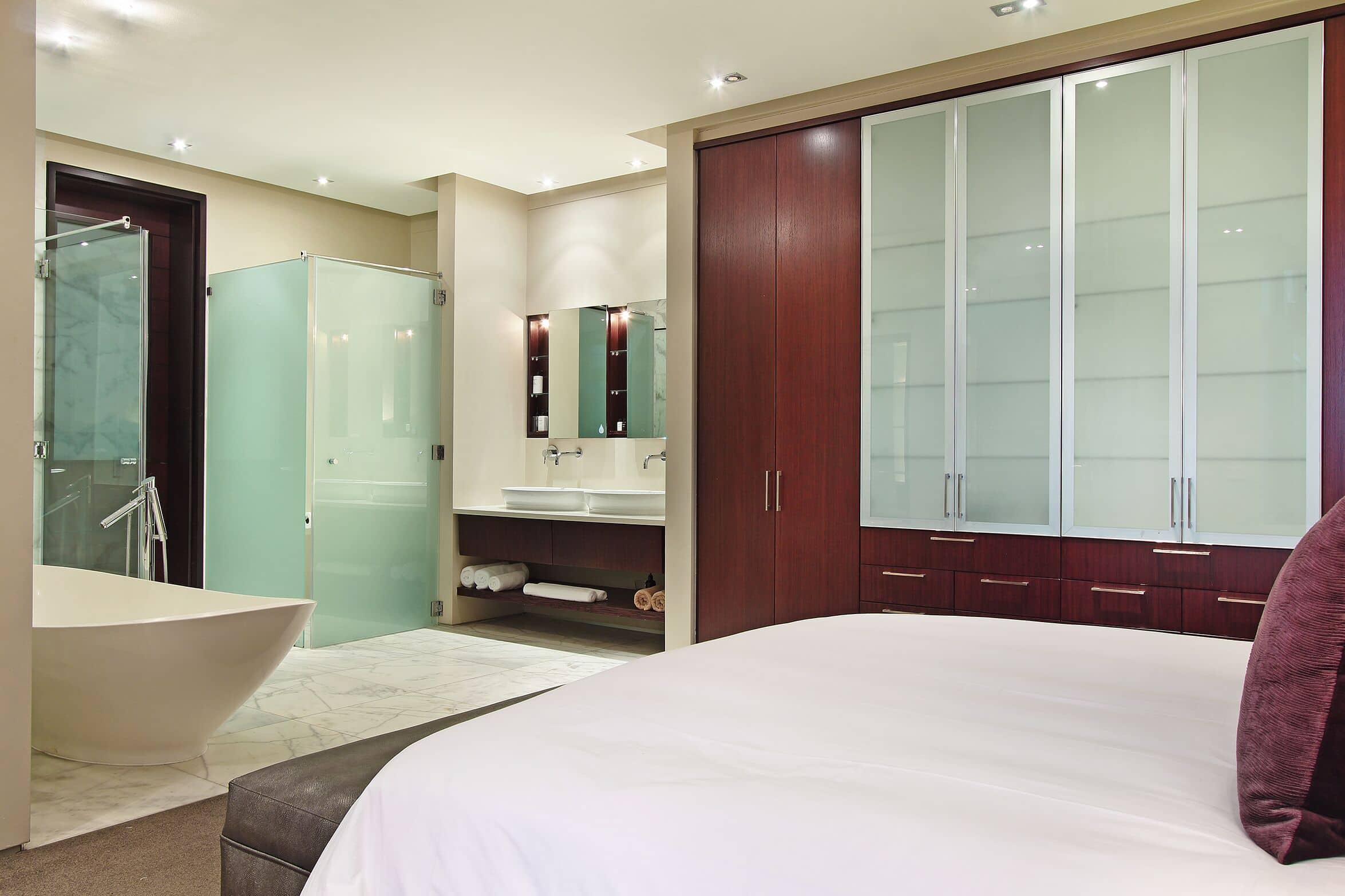 En-suite bathroom with double vanity, bath, walk in shower and heated shower rail