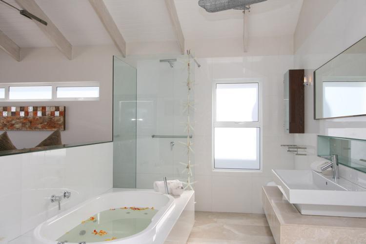 The main bedroom has a King-size bed and open plan en-suite with a spa bath and separate shower. The second bedroom has twin beds, a TV, an en-suite with bath and shower and sliding doors that lead onto a courtyard.