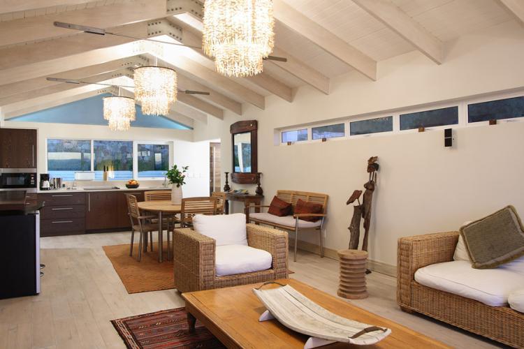 The main living and dining area is exquisite. Exposed beams are home to three chandeliers which light up the room. The fully self-catering kitchen is open plan, with an electric hob and breakfast bar that has seating for two. There is further dining for four and a large TV lounge with comfortable couches and doors which open onto the balcony.