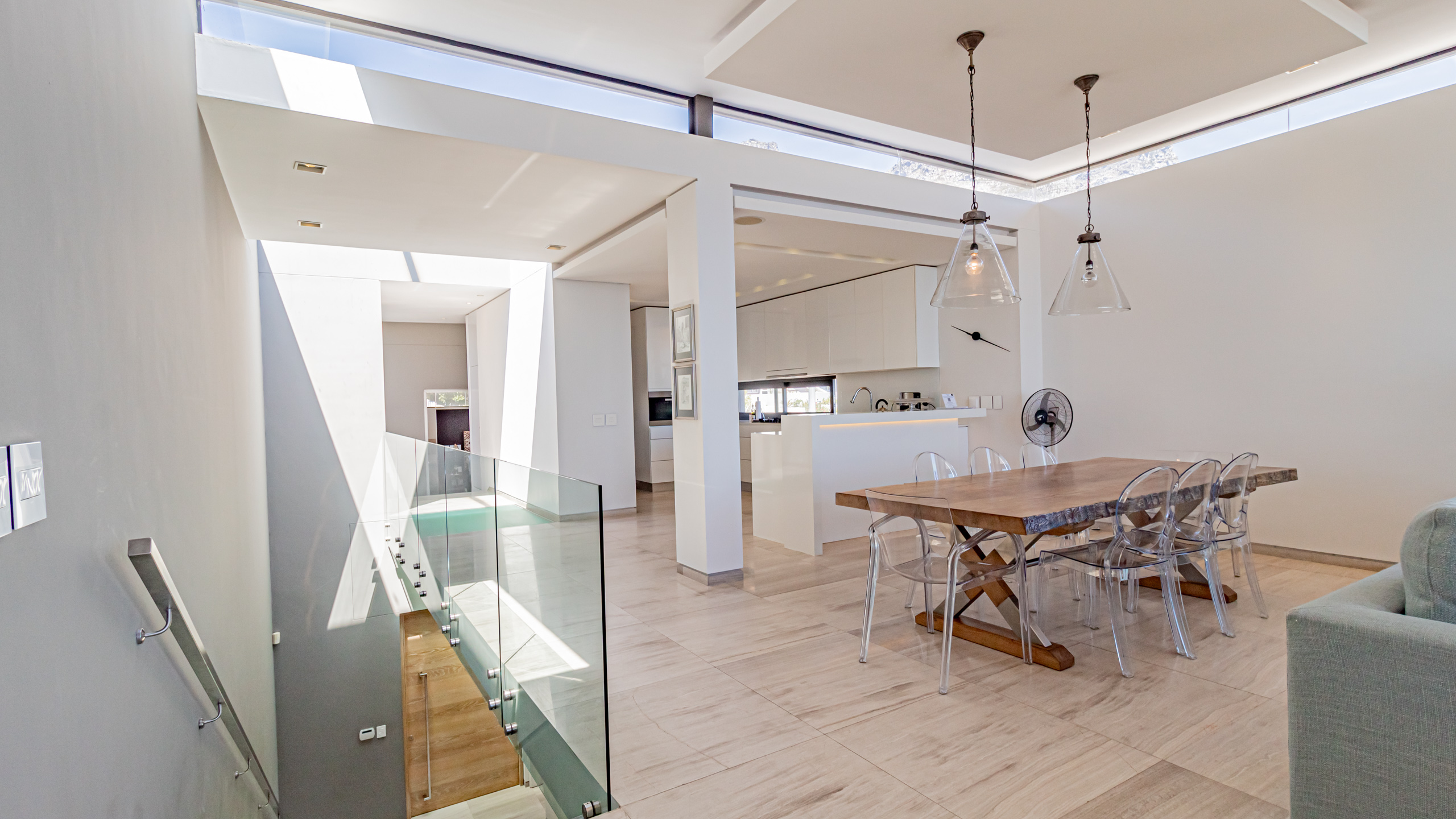 There is a floating staircase with no railing.