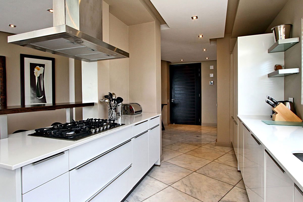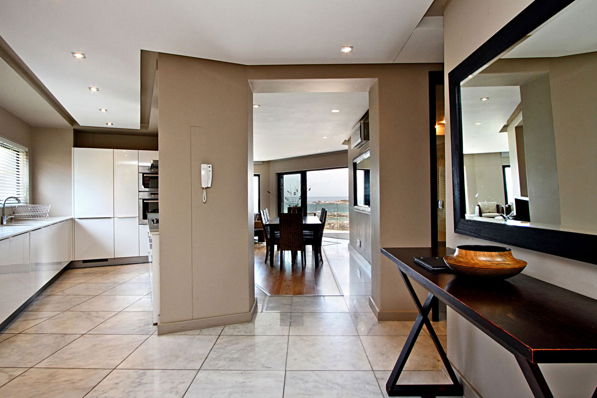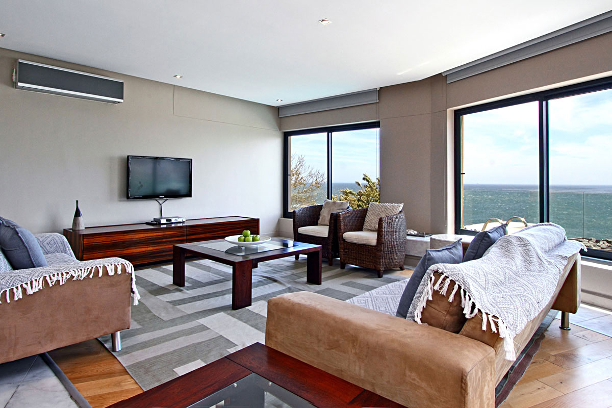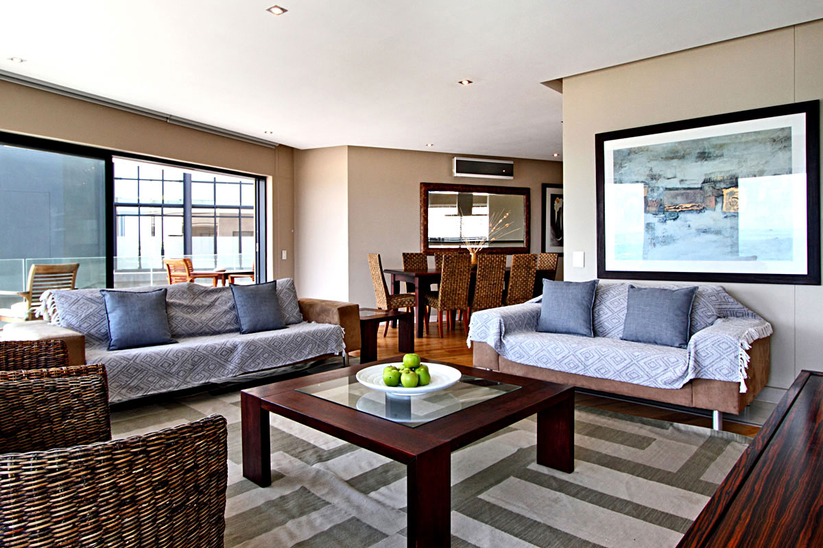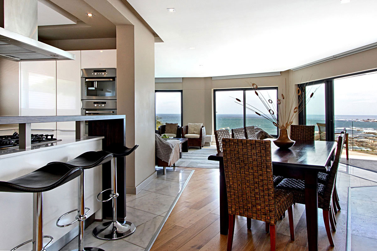 The entrance leads directly into the open plan, modern kitchen area. To the right is a large 8 seater dining room table. The living room leads off the kitchen and enjoys expansive views of the Ocean. A quaint balcony adjoins the living room, perfect for evenings enjoying the famous Camps Bay Sunsets.