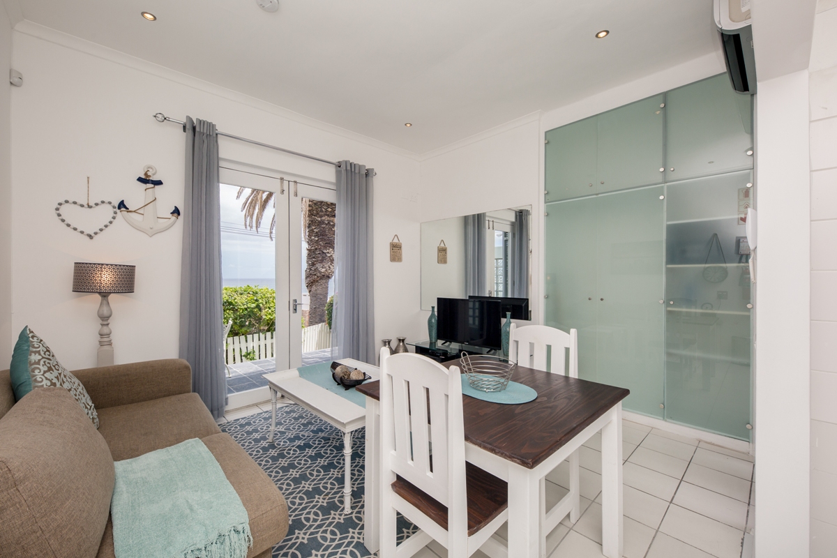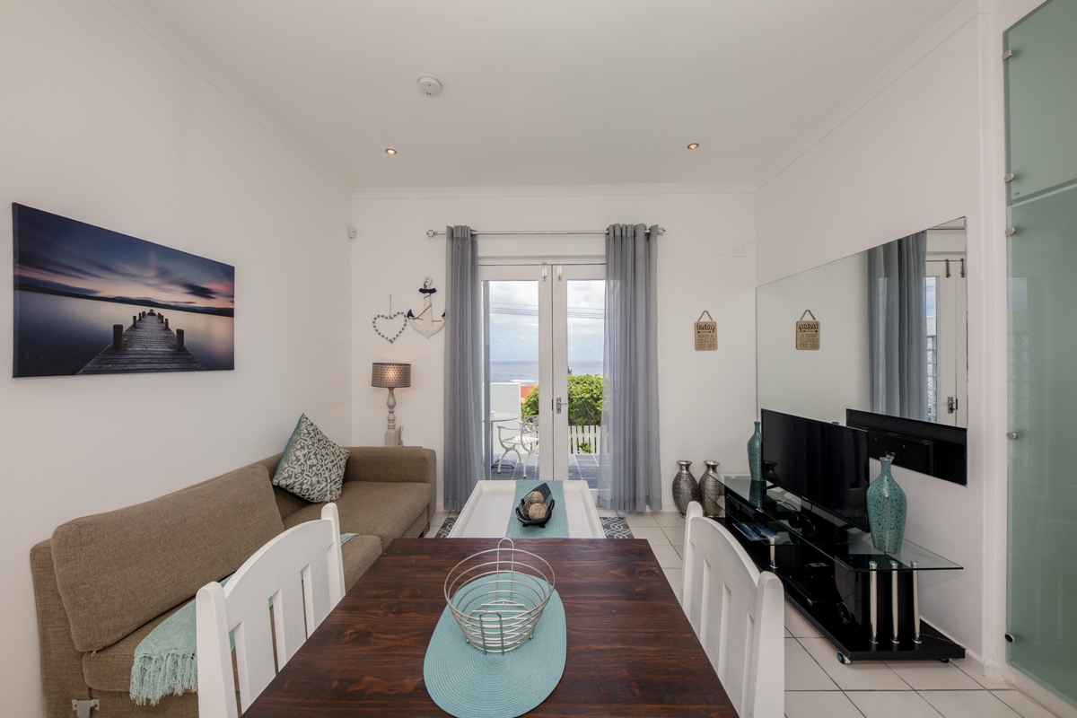 The open-plan living space has comfortable furnishings and a compact kitchen. The apartment has air-conditioning, DSTV and Netflix.