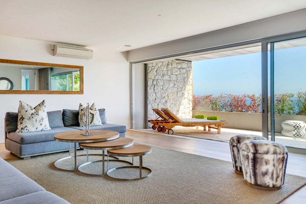It is magnificent, with breath-taking sea views, a fully equipped kitchen and a spacious open plan living and dining area. This opens onto the patio with a crystal blue swimming pool. All of the beds are made up with crisp white linen and neutral accents to promote a good night’s rest. The master bedroom has a king-size bed, dressing room, air-conditioning and en-suite with large bath. The second bedroom has a queen-size bed and third bedroom has twin beds and a dedicated bathroom. All have their own TV’s.