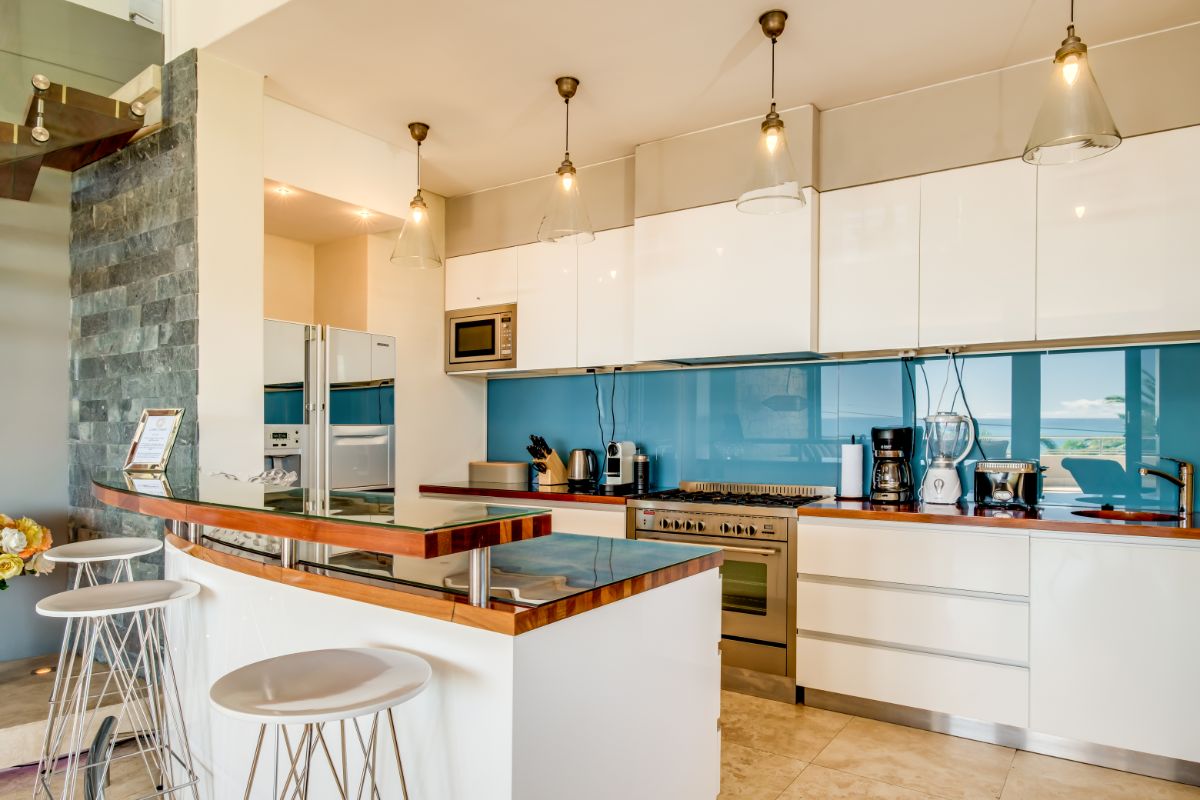 Stairs lead up from the double garage, past the pool to the entrance of the villa which welcomes you into the open plan living and dining areas. There is a comfy L-shaped couch and large flatscreen TV as well as a reading corner. The fully fitted kitchen with separate scullery is towards the back of the room, which is dominated by a wood and glass staircase leading to the 2 large en-suite bedrooms upstairs. There are gorgeous views from the lounge and glass sliding doors leading to a balcony.