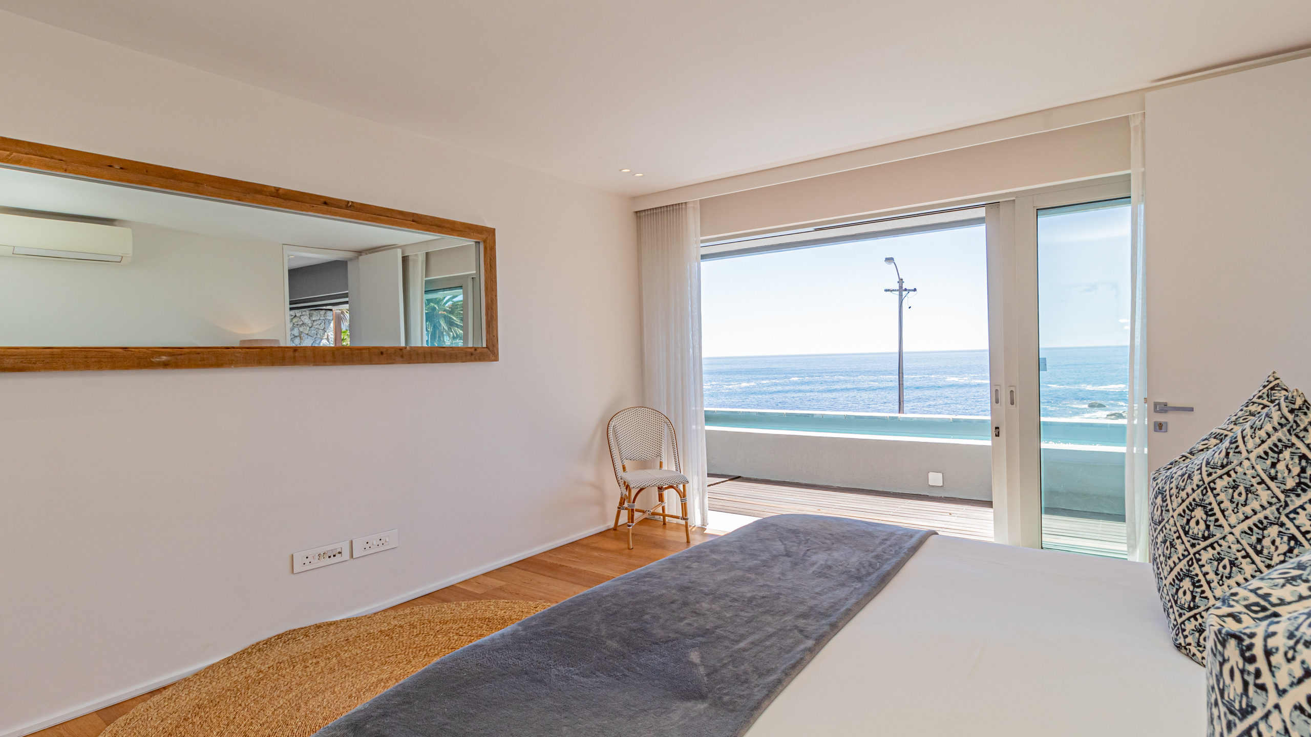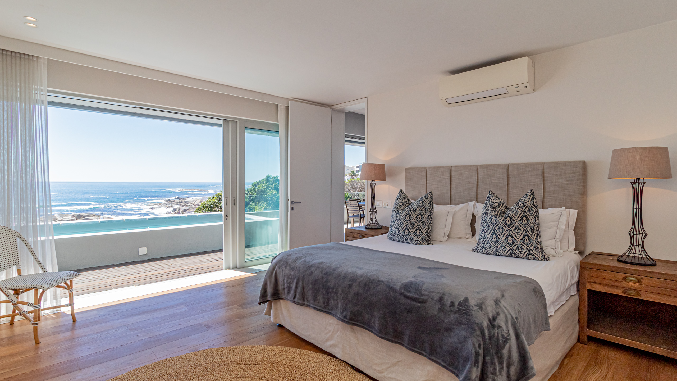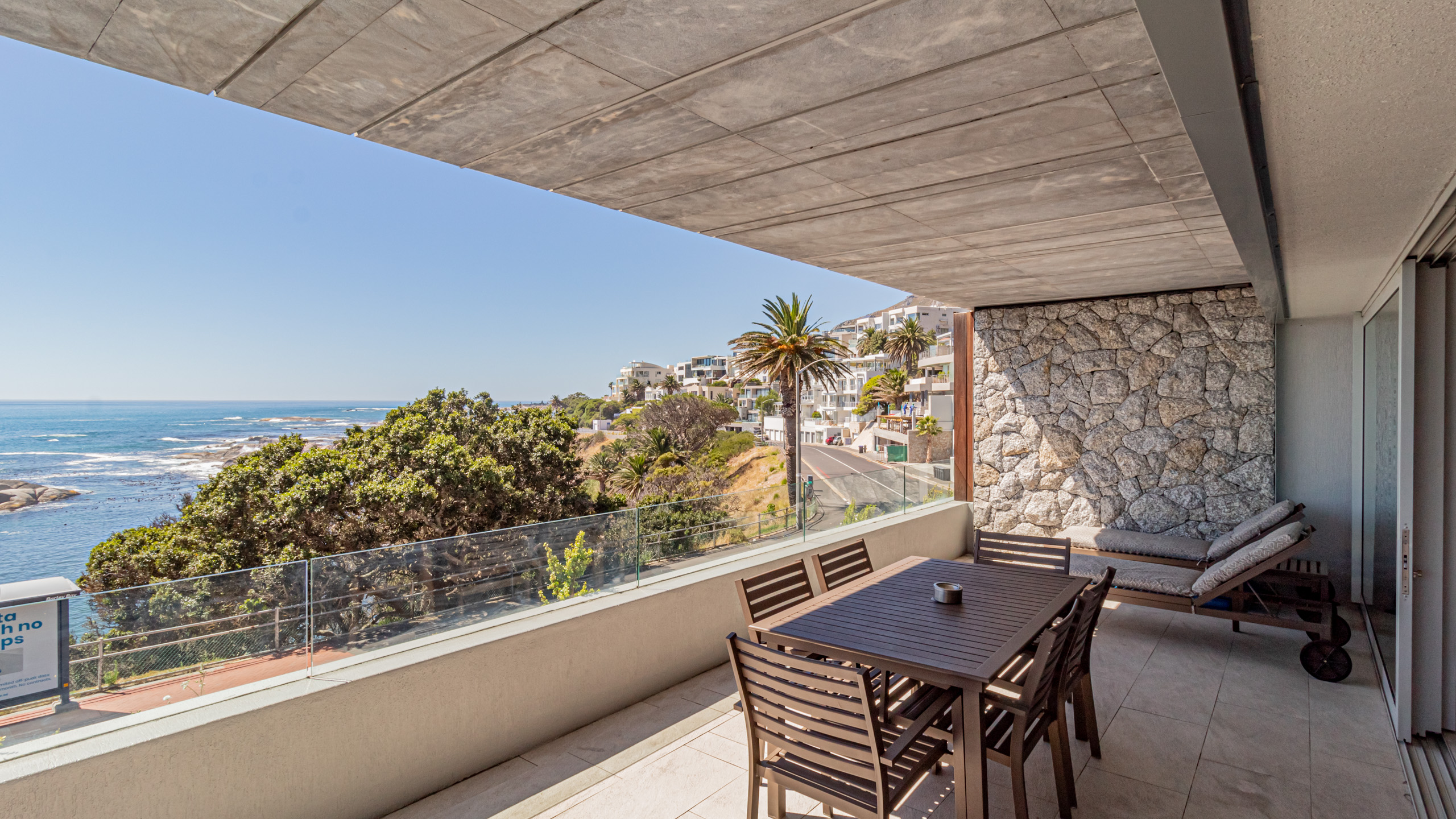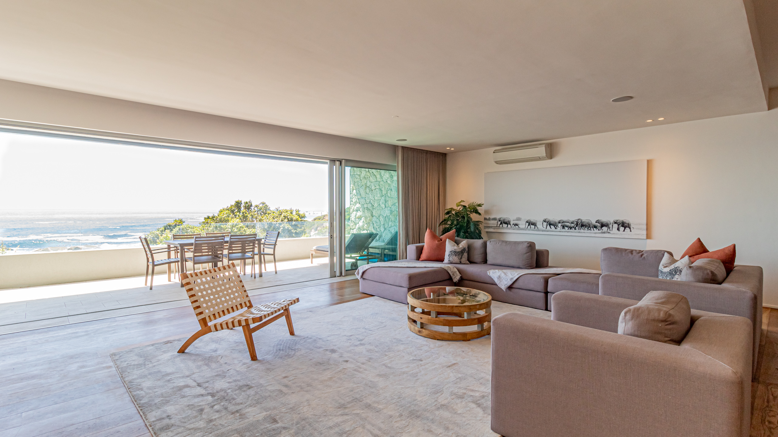 As you walk in you are met with a modern designer kitchen, equipped with top of the range appliances. This is open plan to a large dining area, which seats 8 guests and a TV lounge with comfortable couches. Doors lead out onto a balcony with a pool area and spectacular views of the Atlantic Ocean.