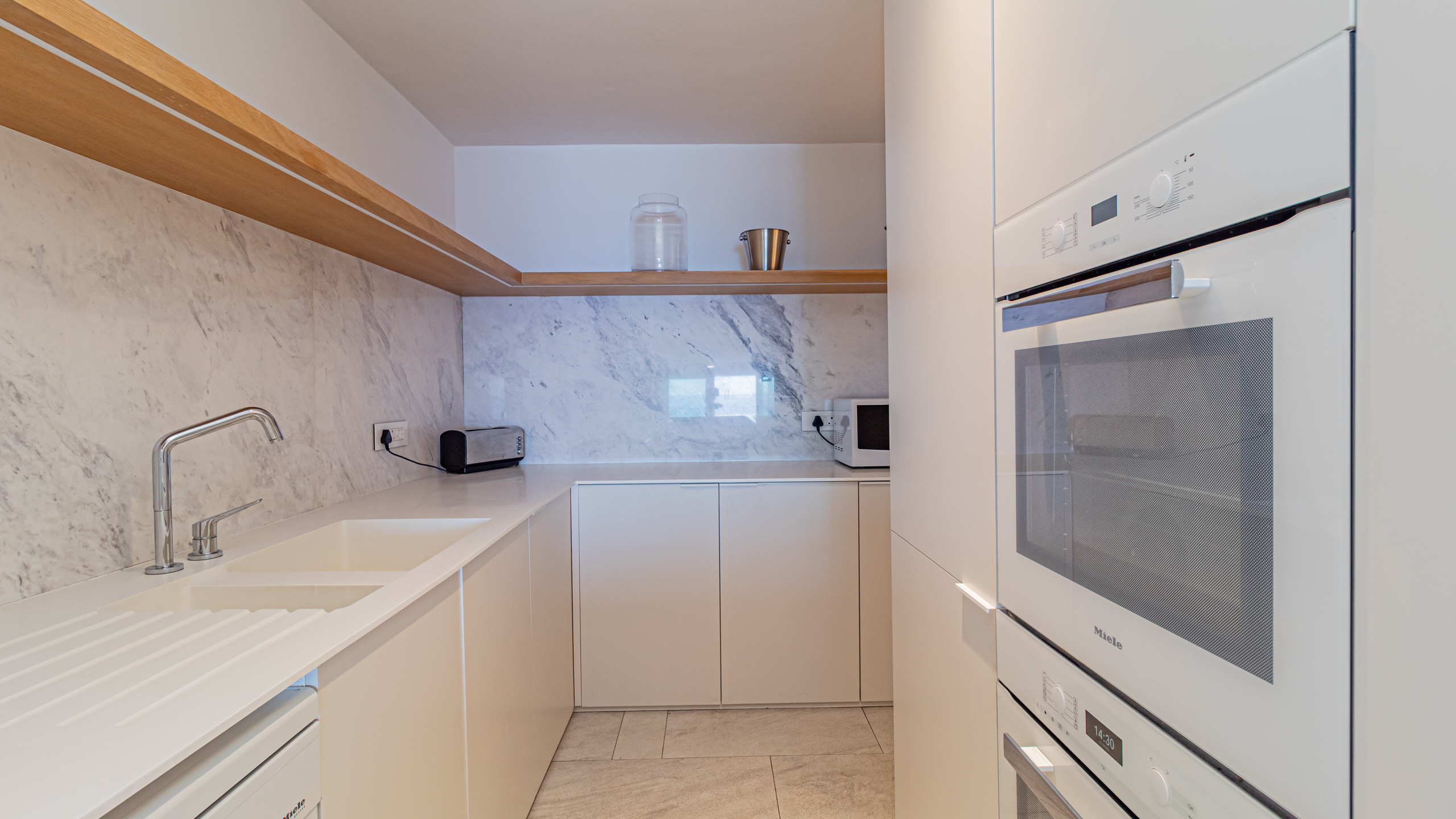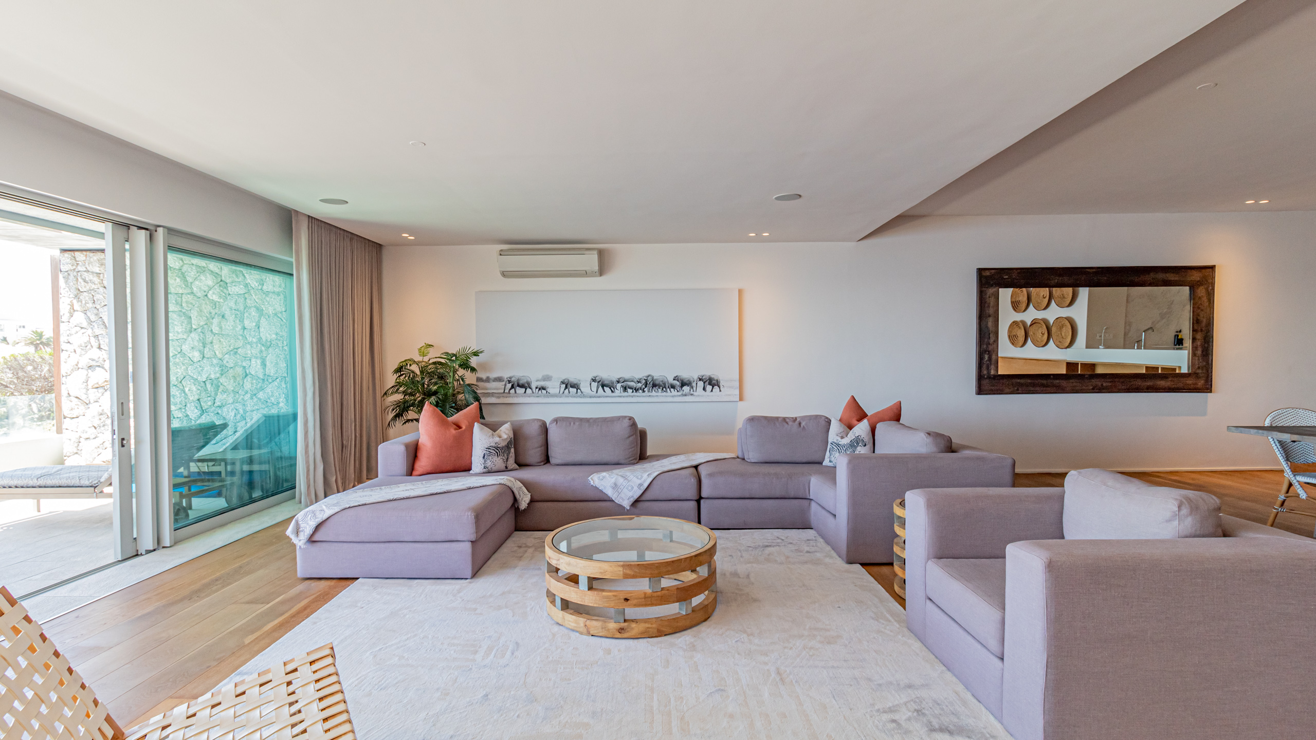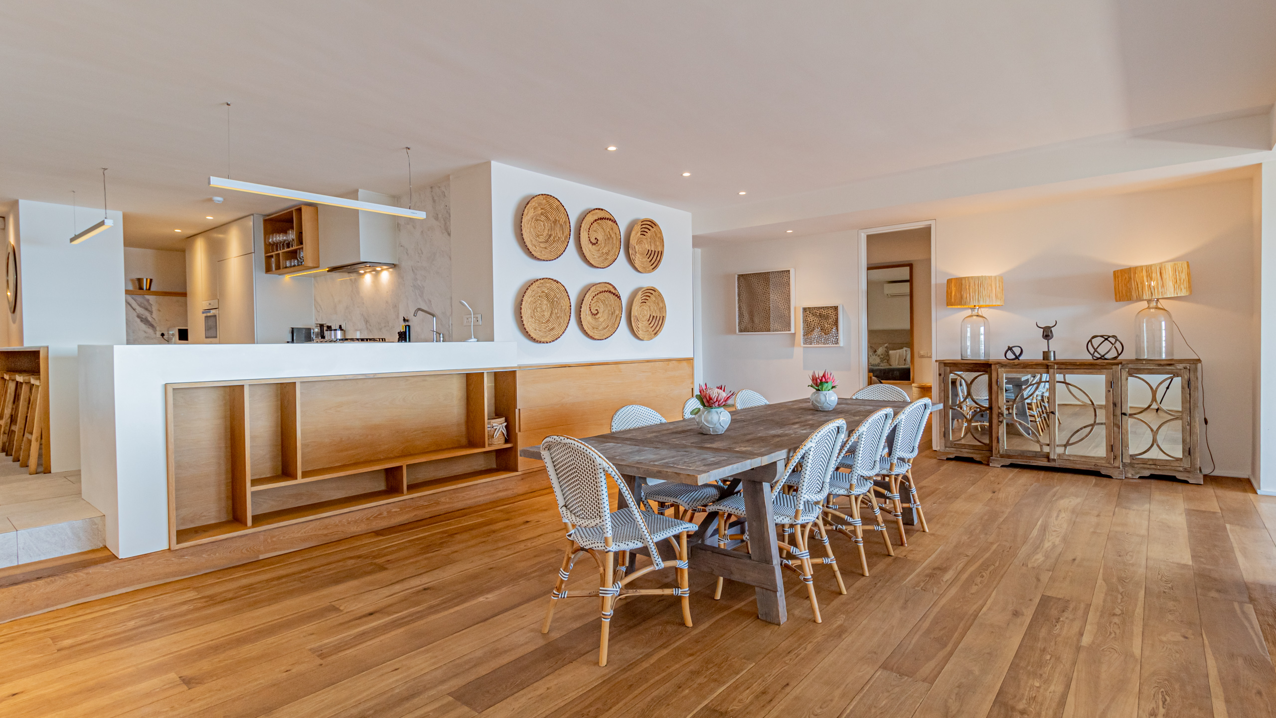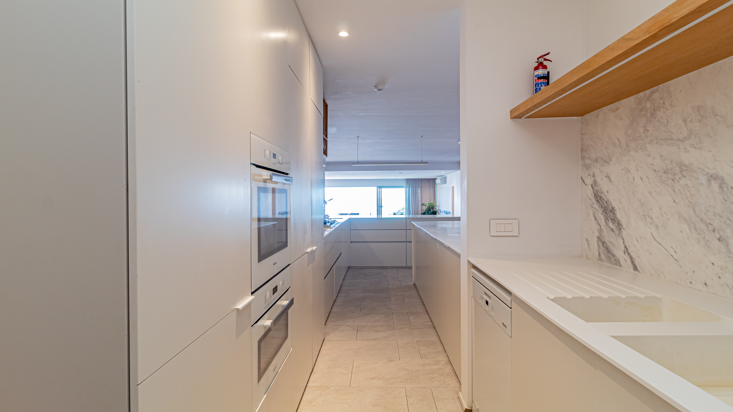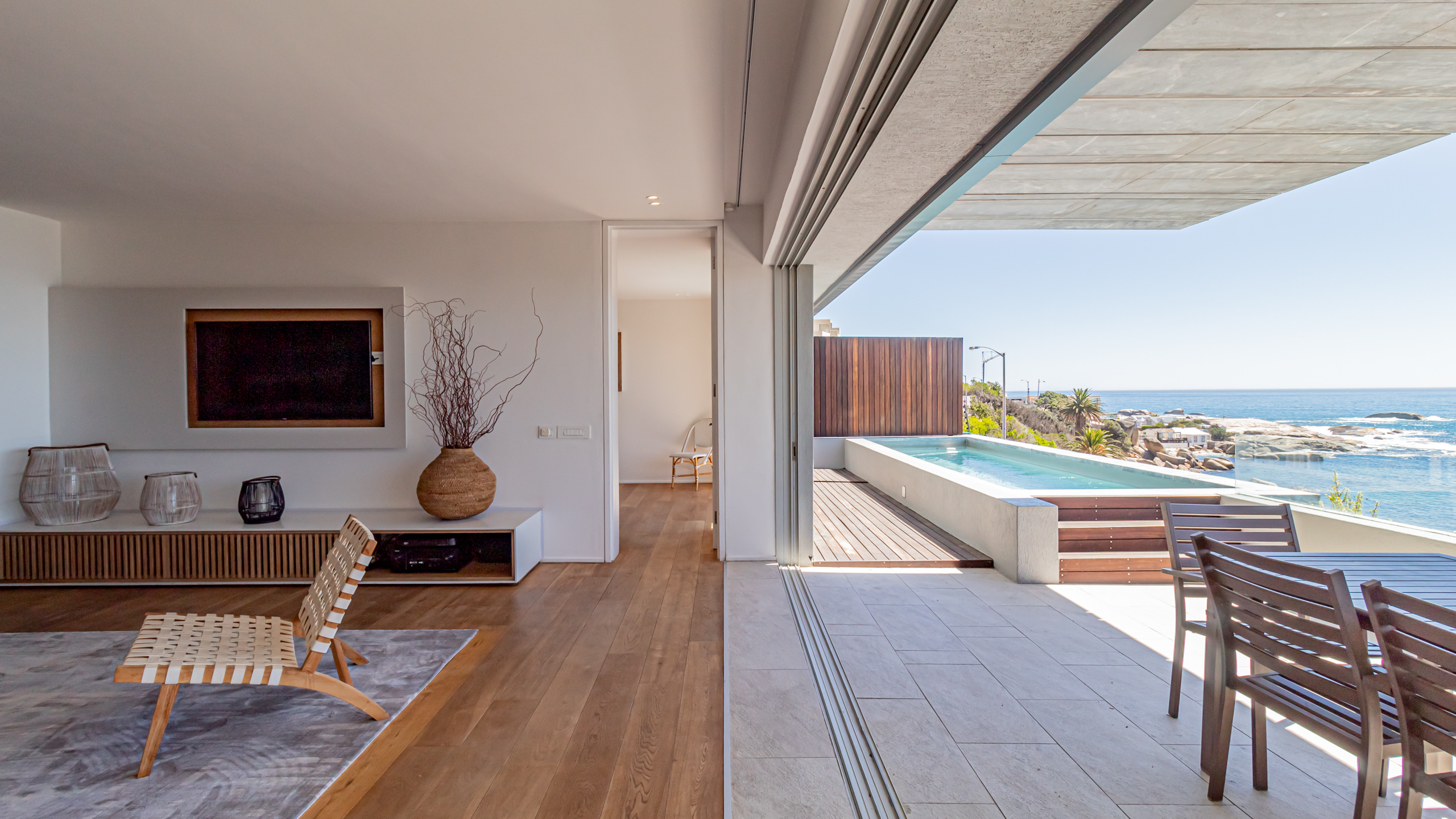 As you walk in you are met with a modern designer kitchen, equipped with top of the range appliances. This is open plan to a large dining area, which seats 8 guests and a TV lounge with comfortable couches. Doors lead out onto a balcony with a pool area and spectacular views of the Atlantic Ocean.