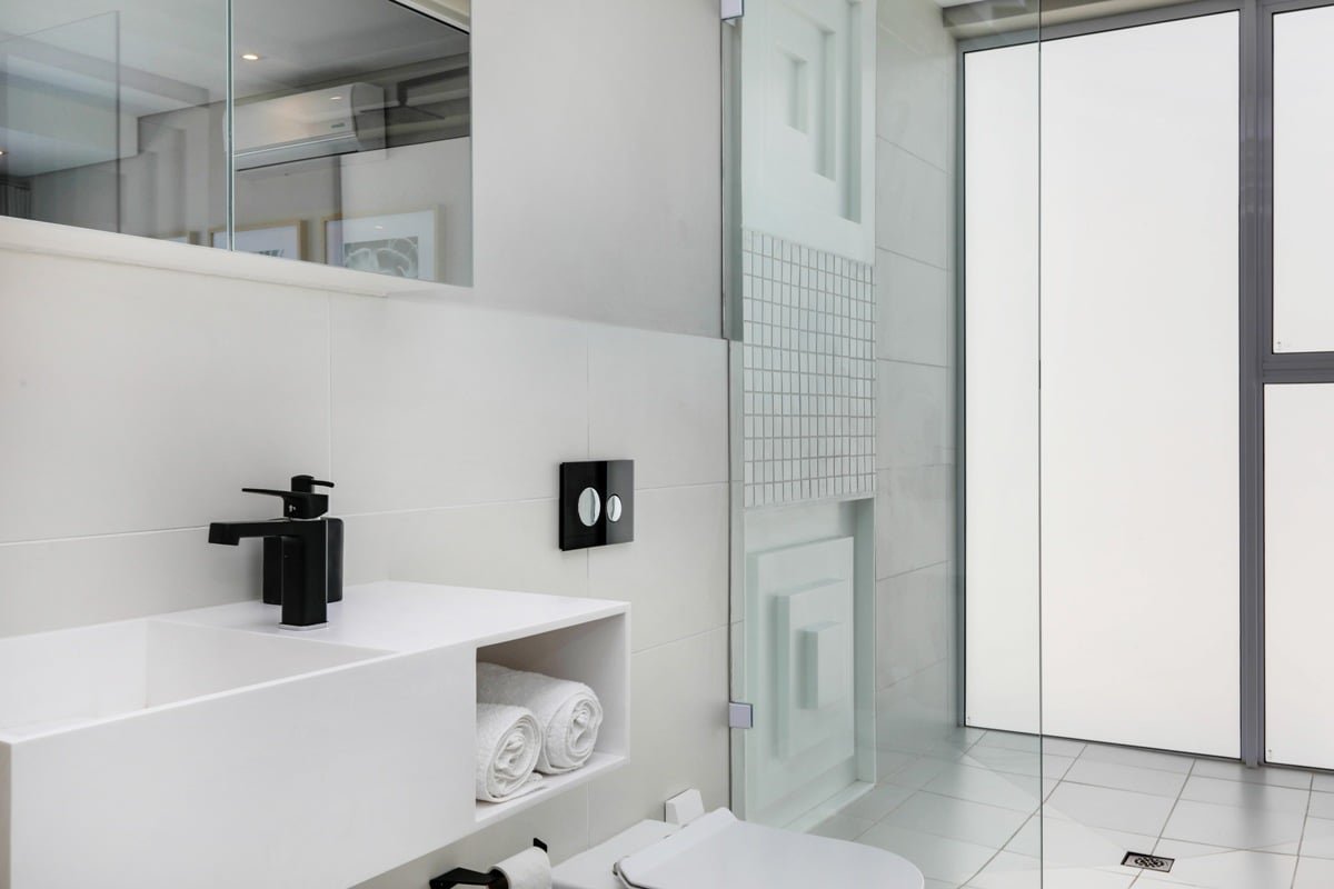 2 interleading bedrooms: The main bedroom has a Queen bed, aircon, sea views and ensuite with bath over shower. The second bedroom has a single bed, TV and ensuite with a shower.