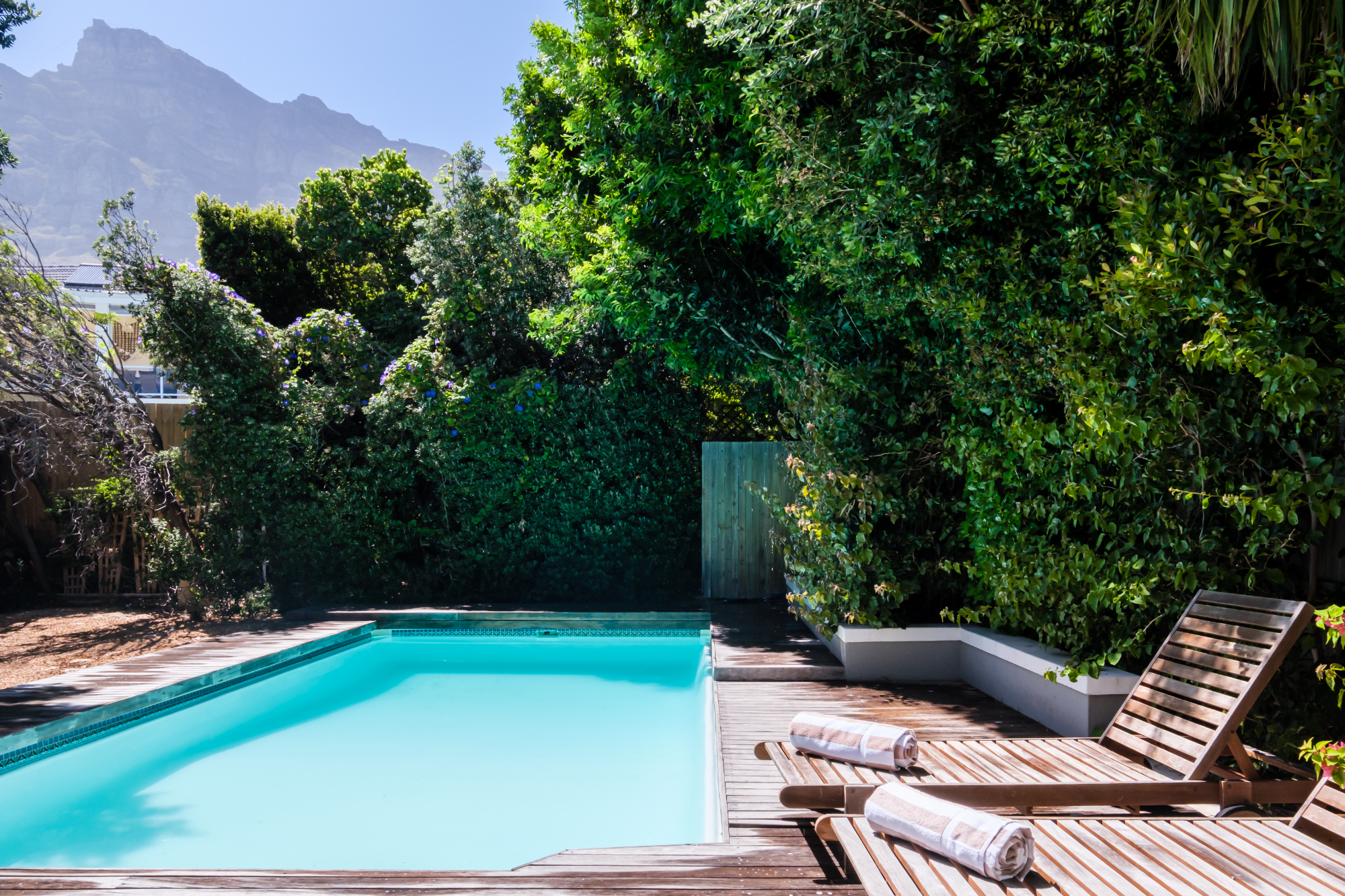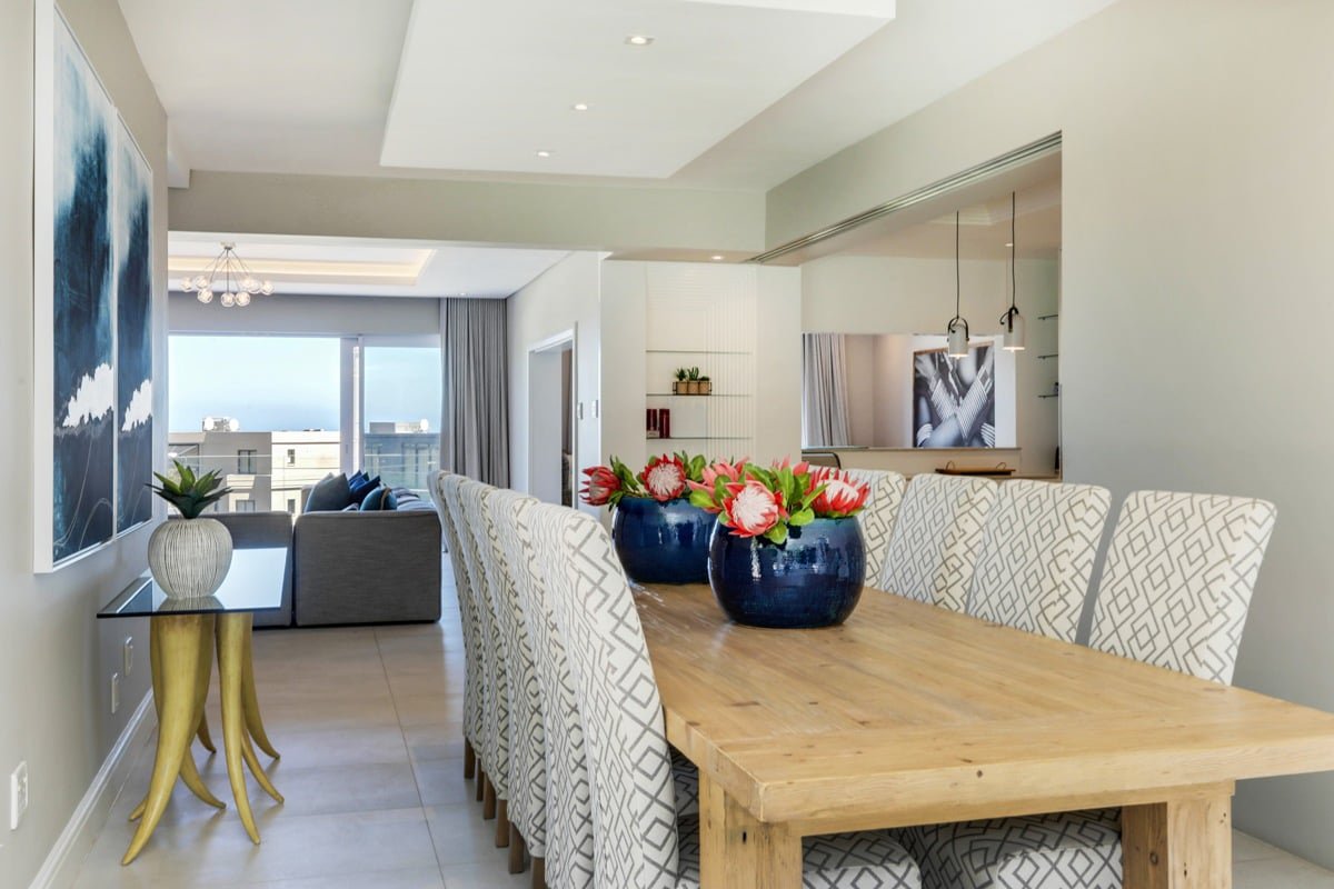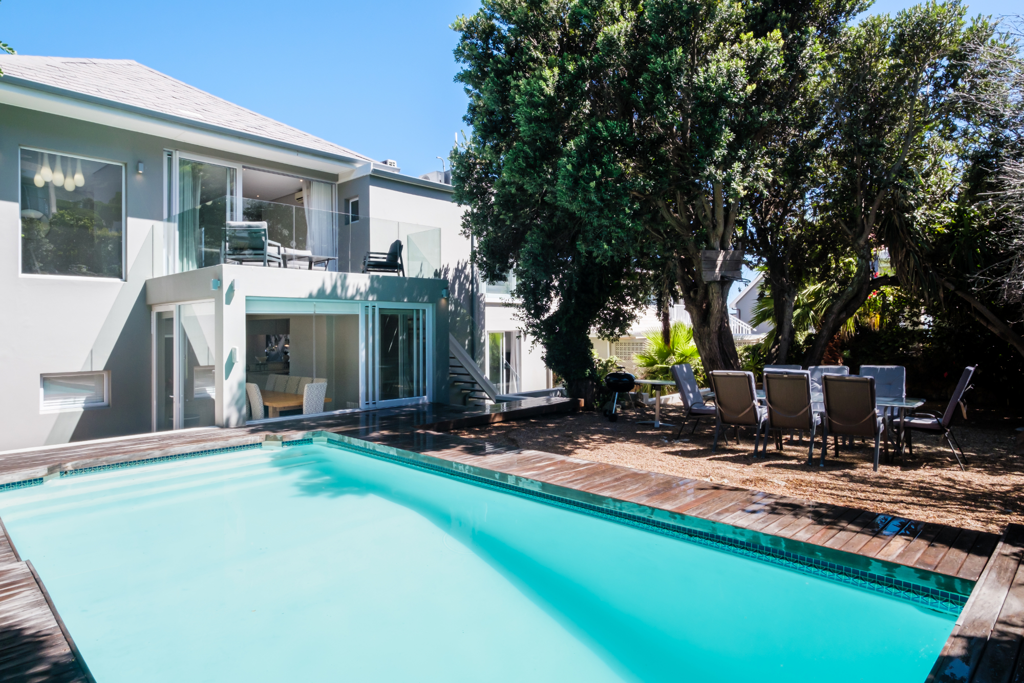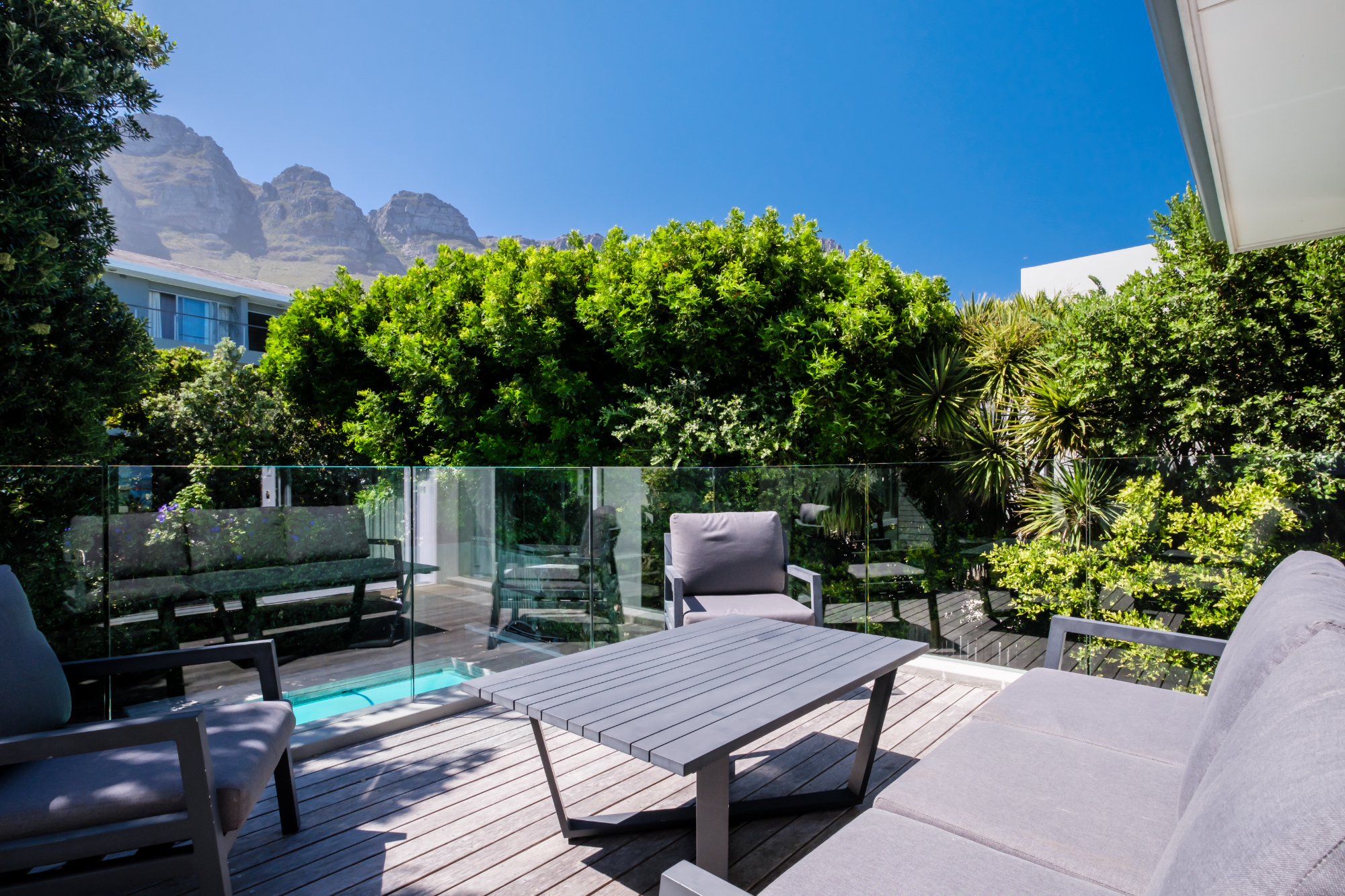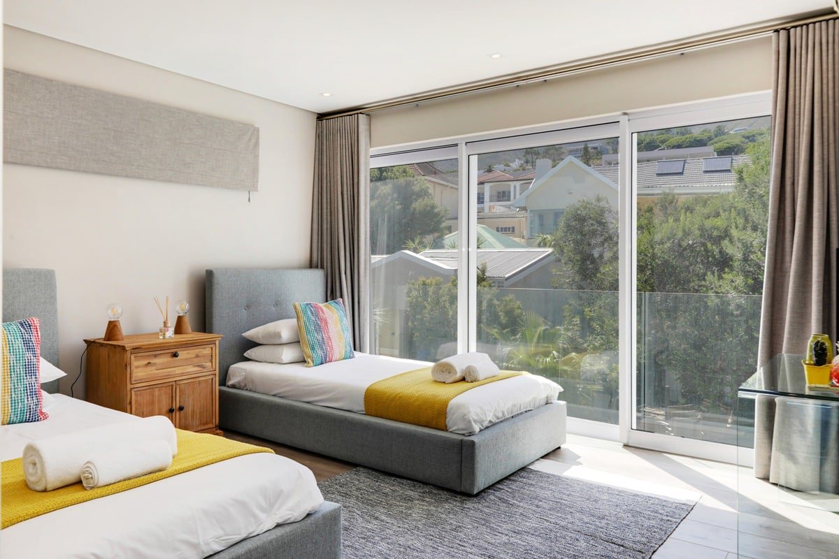Tucked away in the suburb of Camps Bay, Villa Serein offers a retreat with sea and mountain views. This villa features four spacious bedrooms, each with its own en-suite bathroom, ensuring comfort and privacy. The master suite boasts sea views, while the second bedroom enjoys garden and mountain views. The third and fourth bedrooms both offer sea views, with the third featuring a double bed and the fourth a queen bed, both with en-suite showers. A cottage, accessed through the garden, provides additional space with two interleading bedrooms, ideal for families or guests seeking extra privacy.