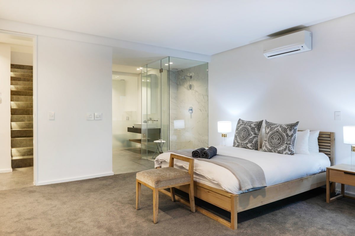 Over 3 stories, the lower level is a 2 bedroom self contained apartment and the upper 2 levels a 3 bedroom apartment. They are joined by a central staircase to create a large space perfect for a group of friends travelling.