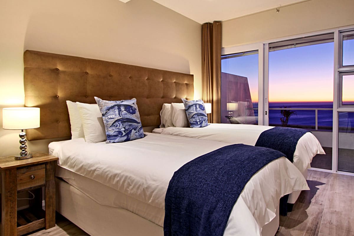 The apartment enters the first-floor living spaces, with floor-to-ceiling windows and uninterrupted ocean views. A contemporary lounge with large couches and a flat screen television is decorated in soft creamy hues, while an open plan kitchen is fully equipped with all the amenities necessary for a hassle-free holiday, including fridge/freezer, microwave and gas stove. There is one bedroom on this level with bunk beds, which is perfect for children, as well as a conveniently situated guest toilet.