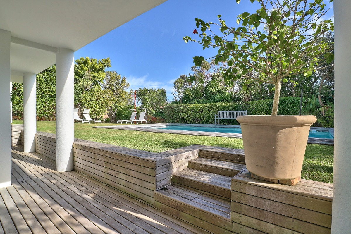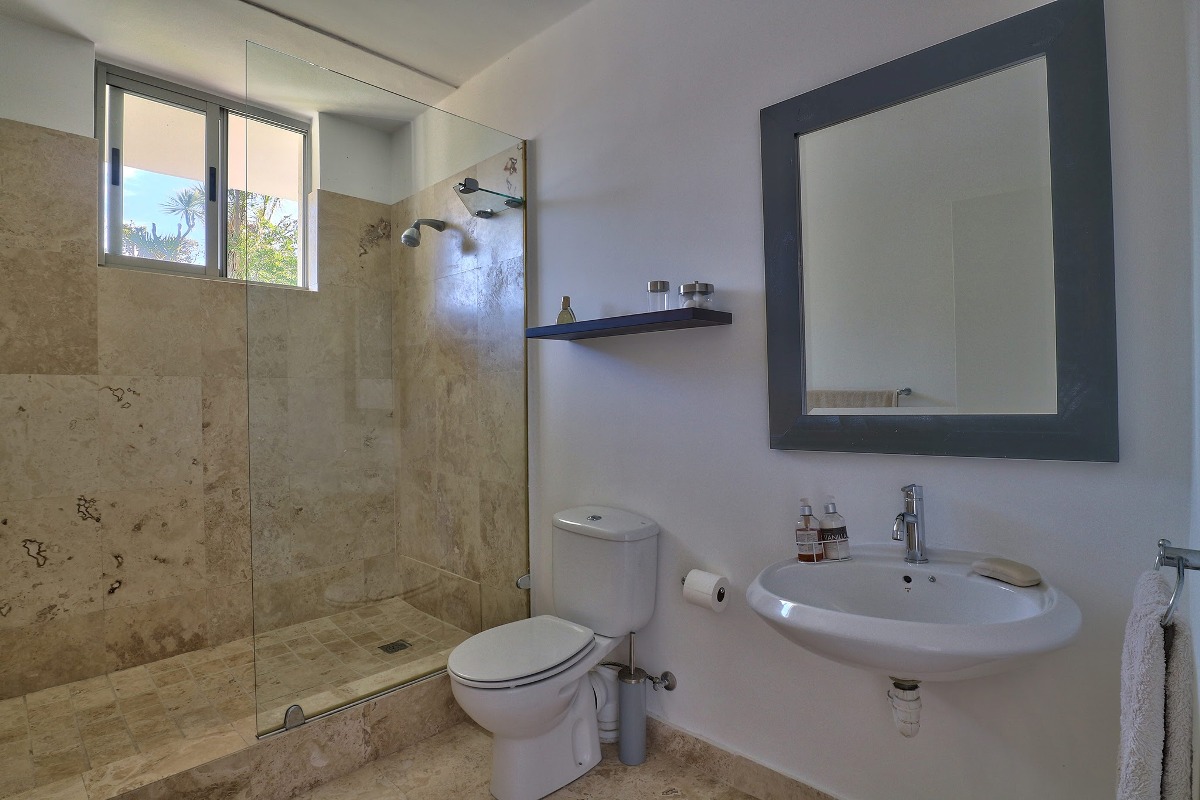 On the lowest level of the villa are the remaining two bedrooms, which both have a double bed and that share an interleading bathroom. The rooms also have outdoor access to a large garden with a swimming pool and sun loungers.