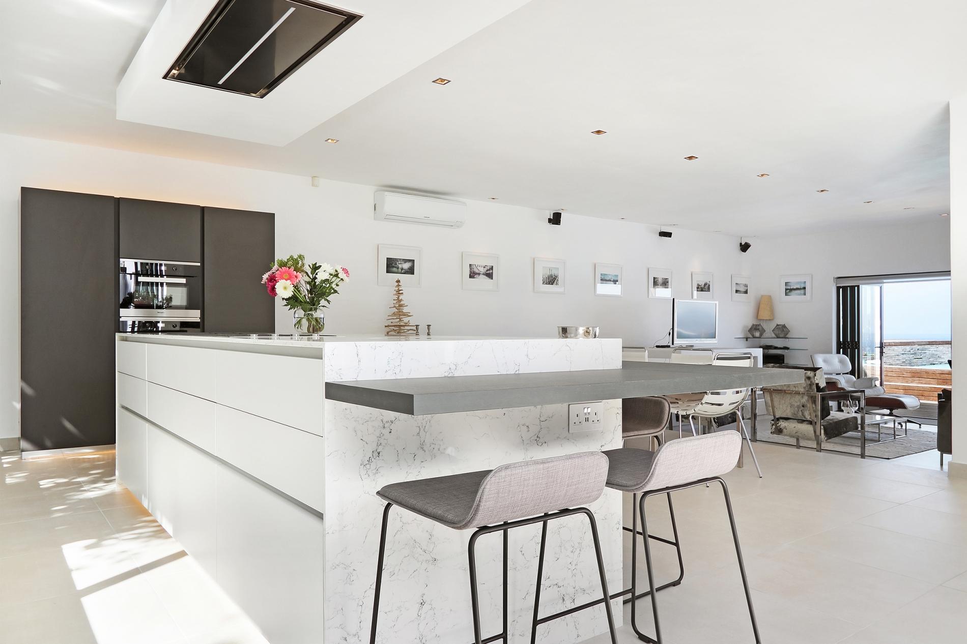 The villa is split on two levels. On entering the villa you are greeted with the open plan lounge, dining and kitchen areas. The lounge has a lovely large plasma TV and big comfy couches to relax in. A pebble fireplace makes it an ideal space for those cold winter nights.