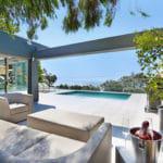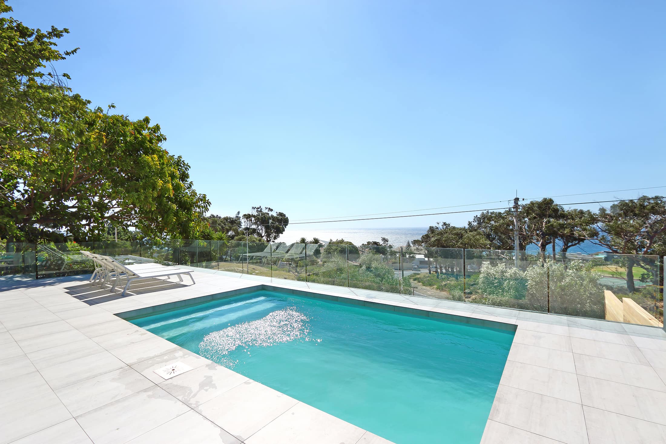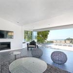 Glass walls overlook pool and ocean