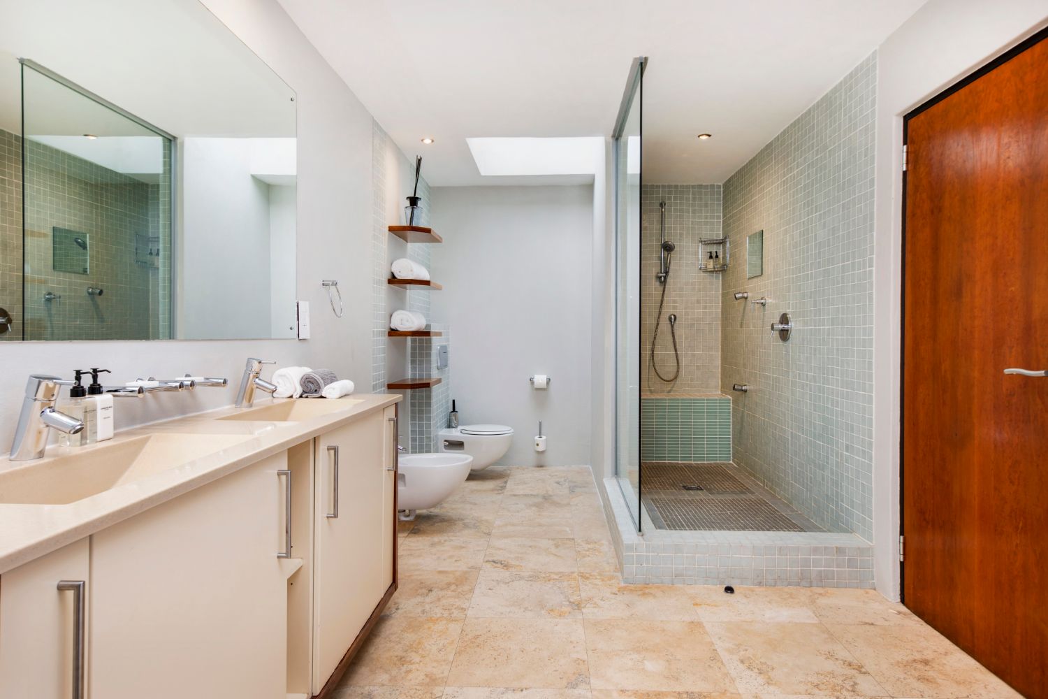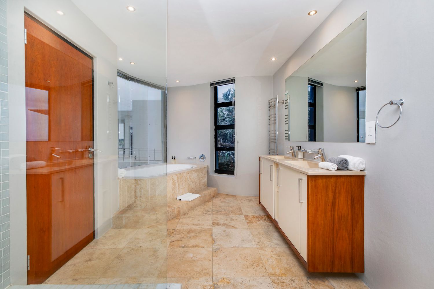 En-suite with spa bath with sea view, large shower with jets, toilet and bidet, double vanity, heated towel rails