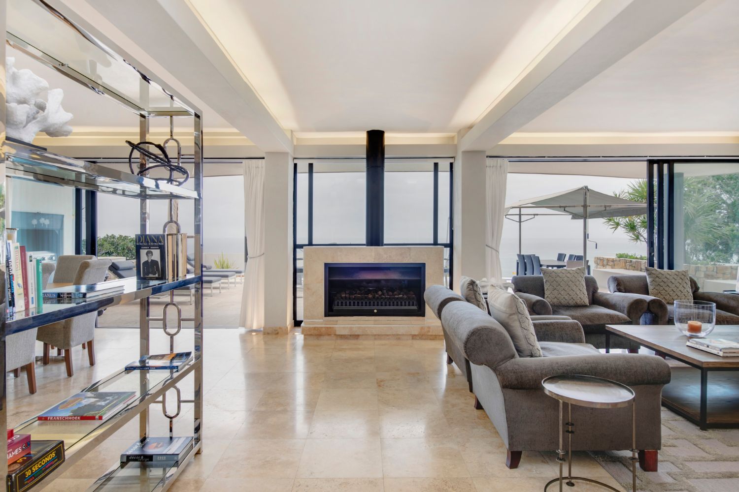 The living area is a seamless blend of elegance and relaxation, featuring uninterrupted sea views, ample lounge seating, a large TV with surround sound, and a formal dining area. The fully equipped kitchen, gym, and private patio with a gas BBQ, Weber, and pool create an ideal space for leisure and entertainment.