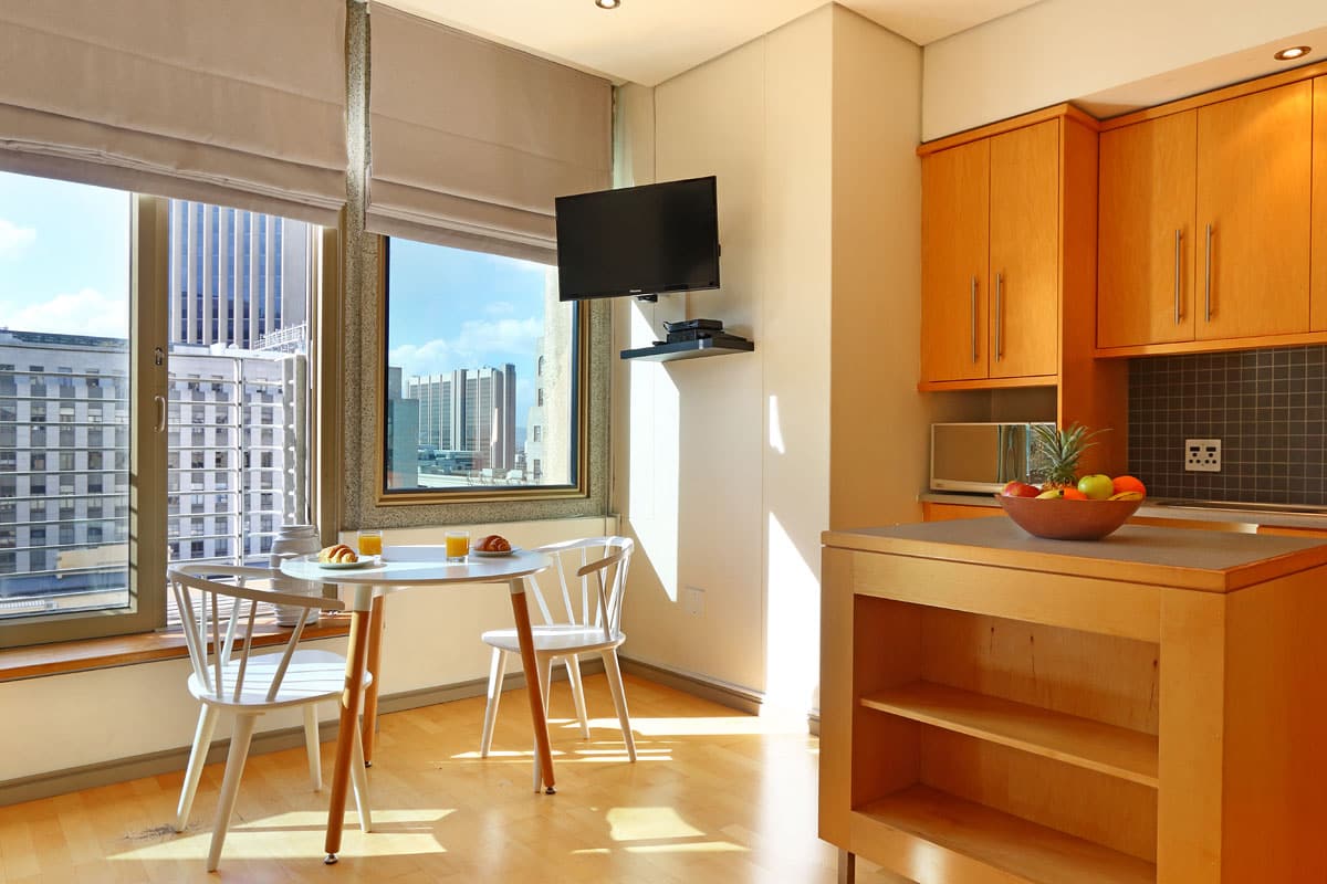 The fully equipped kitchen boasts a glass, touch-top stove as well as a large island, perfect for food preparations. Leading off from the kitchen is a dining area with seating for two and a door leading outside onto a Juliette balcony with city views.