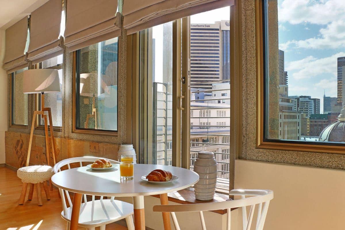 Dining area opens out onto balcony, with city views to enjoy with meals