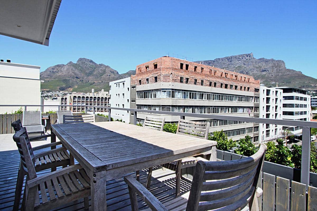 Continue up the winding stairwell to the third level of the apartment, which is a bright room with couches and a small kitchenette with a dishwasher and a sink. This room opens onto a wooden rooftop deck which boasts an eight-seater dining table, and breath-taking views of Table Mountain and the city below.