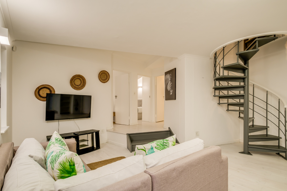A spiral staircase leads down to the lower level of the cottage, which houses two bedrooms, a semi-equipped kitchenette and television lounge. The kitchen offers a fridge/freezer, microwave and Nespresso coffee machine and the comfortable lounge has a large flat-screen television and large couches.