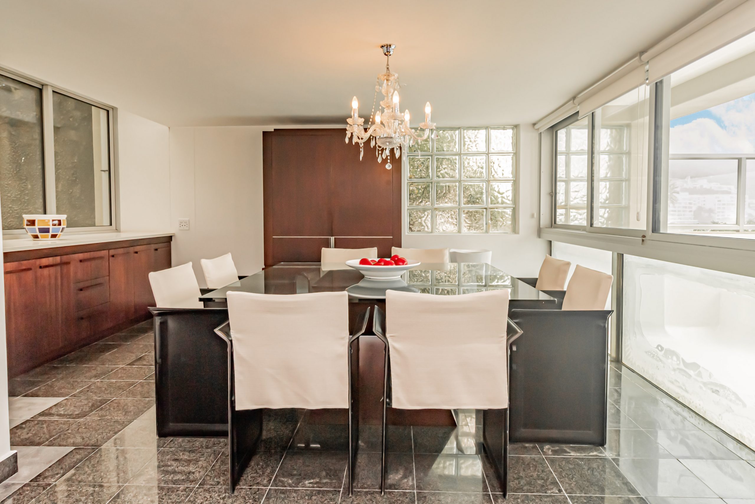 Commanding breath-taking views of the Atlantic Ocean, the master bedroom is decorated in warm, opulent tones that imbibe a rich, luxurious feel. Opening onto a private terrace that overlooks the beach below, a lavish king-sized bed and spacious en-suite bathroom in black, chrome and marble tones offer deluxe style and comfort. Sleek, contemporary-chic décor continues in the second and third bedrooms of the apartment, which offer twin (which can be converted to a king), and double beds. Both rooms share a luxurious bathroom with bath, shower and bidet.