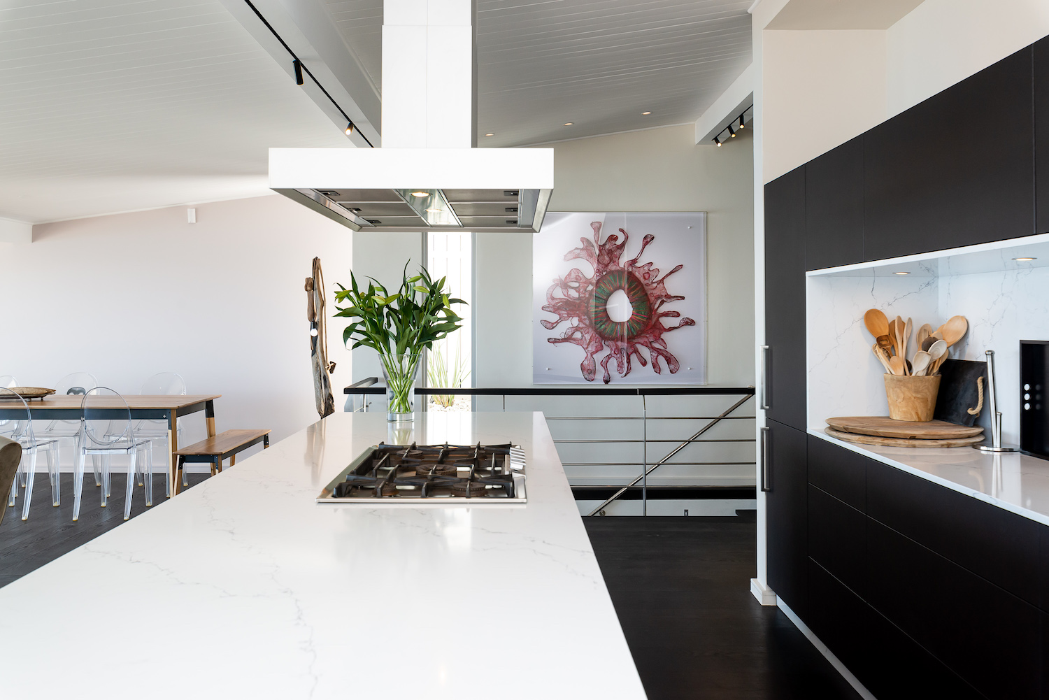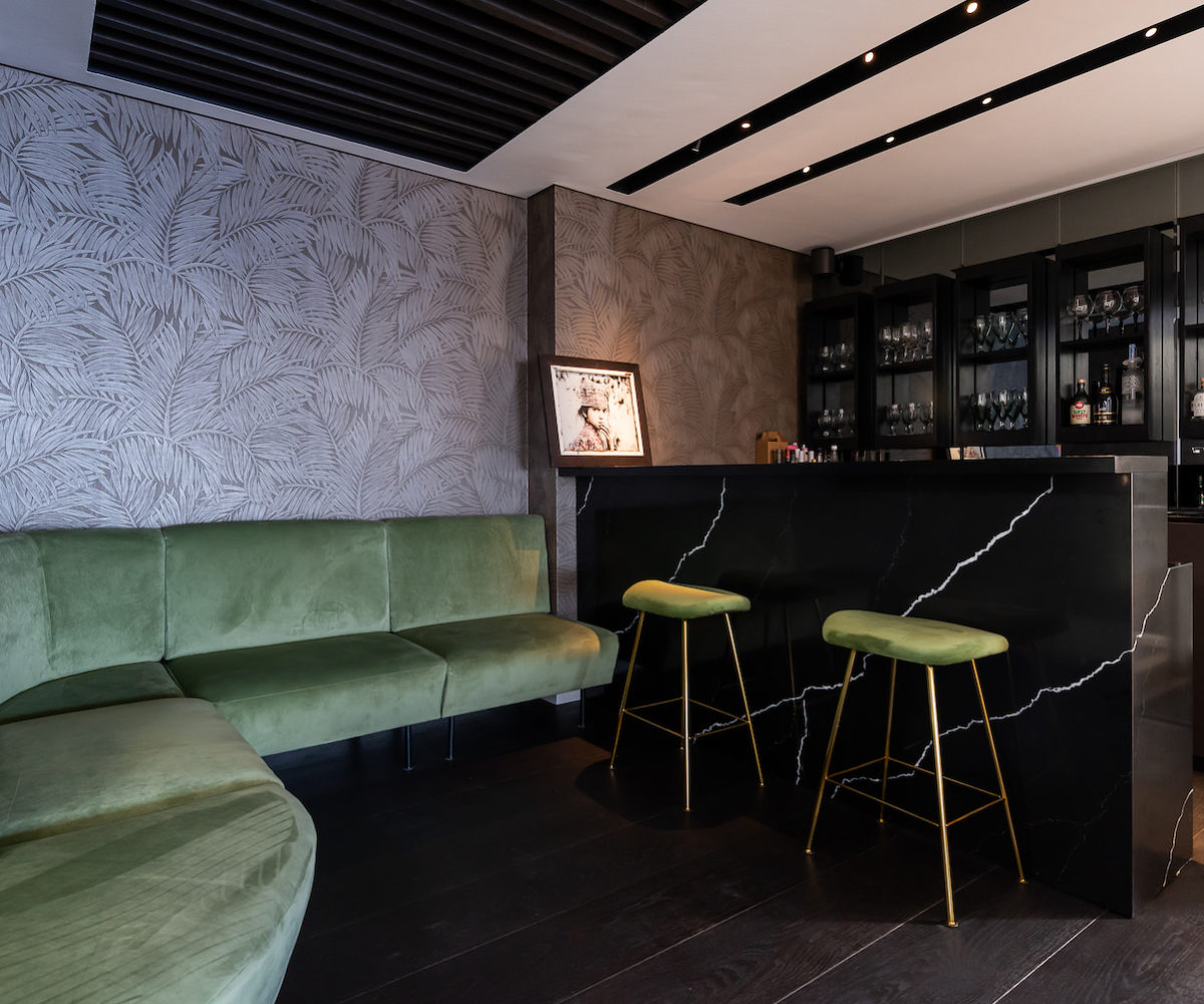 The kitchen is equipped with modern appliances (and a convenient scullery behind), there is an 8 seater dining table and a trendy bar area.