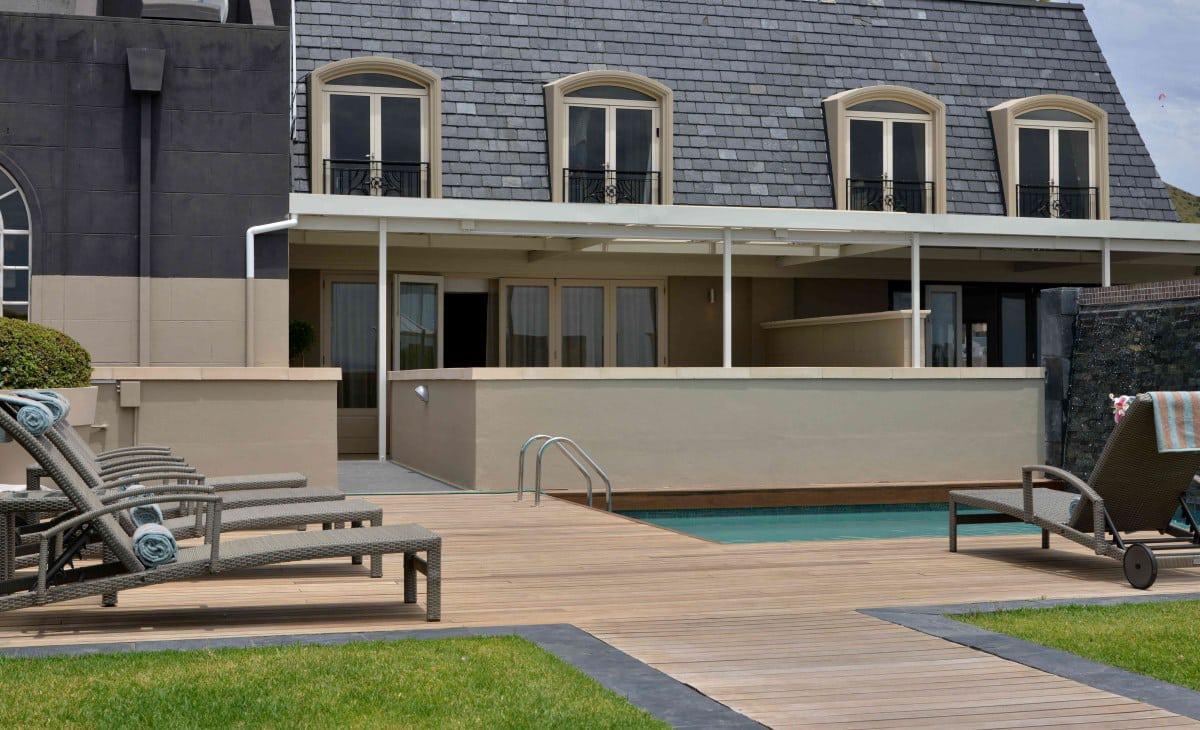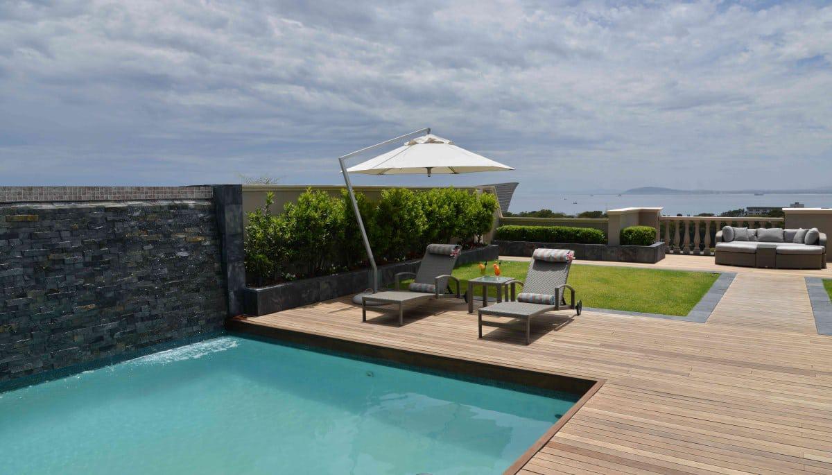 Inside, there is a fully equipped kitchen as well as a dining area with seating for 8 guests. The lounge features a large L-shaped couch as well as plush chairs and a flat screen TV. Doors open onto a covered patio with outdoor seating and this leads to a rooftop swimming pool and garden area.