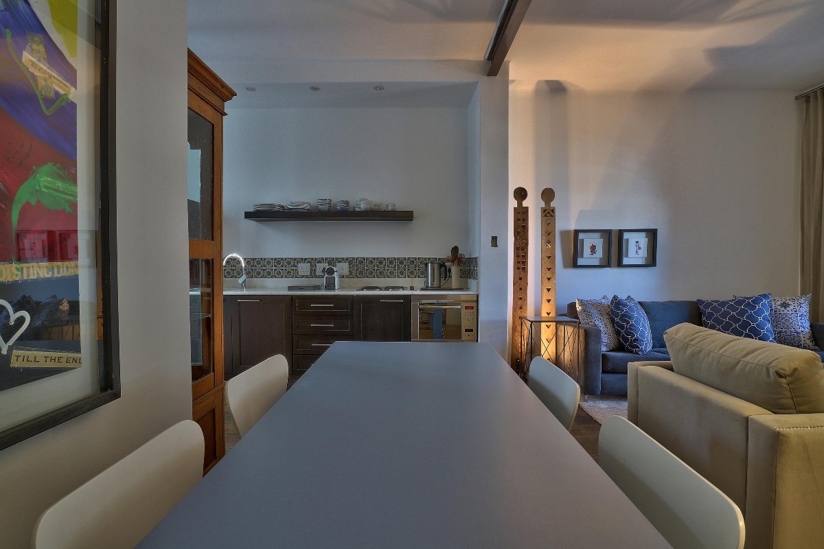 The lounge is a great place for unwinding after a long day, or simply curling up to enjoy a good book. There is also a luxurious leather recliner. Leading off from the lounge is a dining area, which seats four guests and this flows into the kitchen. Fully self-catering it contains all the essentials, including a coffee machine.