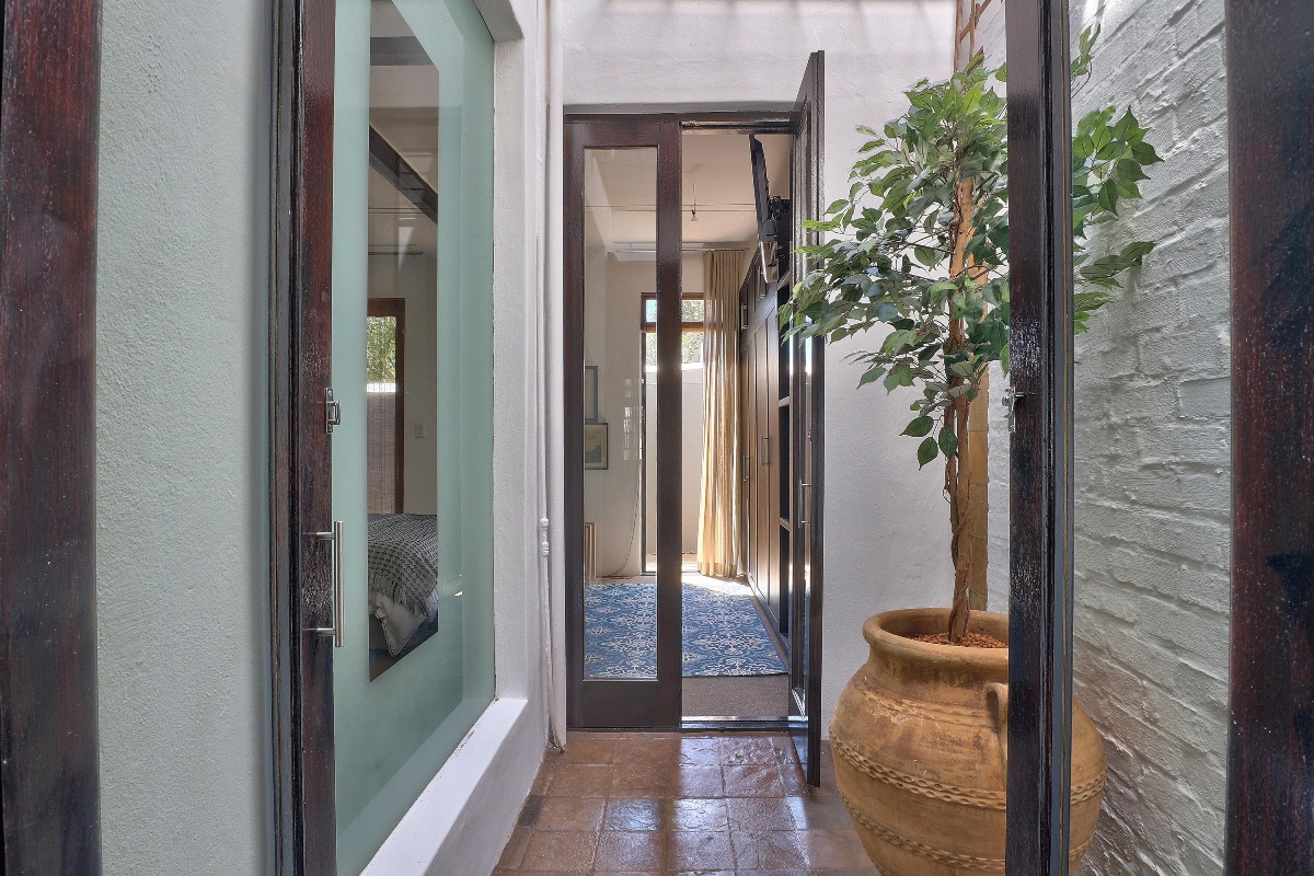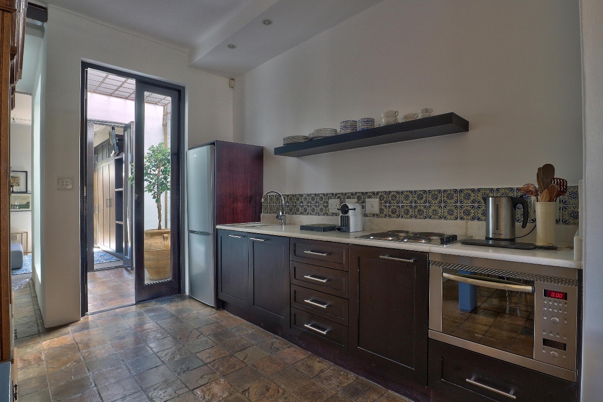 There is a small courtyard between the kitchen and bedroom, which allows the light to flood in through the glass doors.