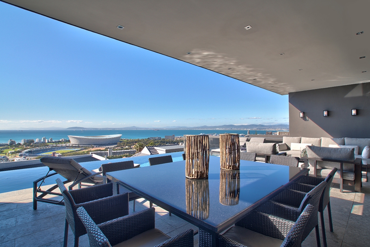 In the main living area is a wonderful open-plan kitchen, equipped with all the essentials and plenty of space to prepare delicious meals. Seating for 6 is available at the counter, but there is also a formal dining area which seats 10 guests comfortably. Next to the dining area is a lounge with large couches, all facing the terrace, where you are able to enjoy exquisite views of the city and Atlantic Ocean. There is also a separate TV lounge which can be closed off.