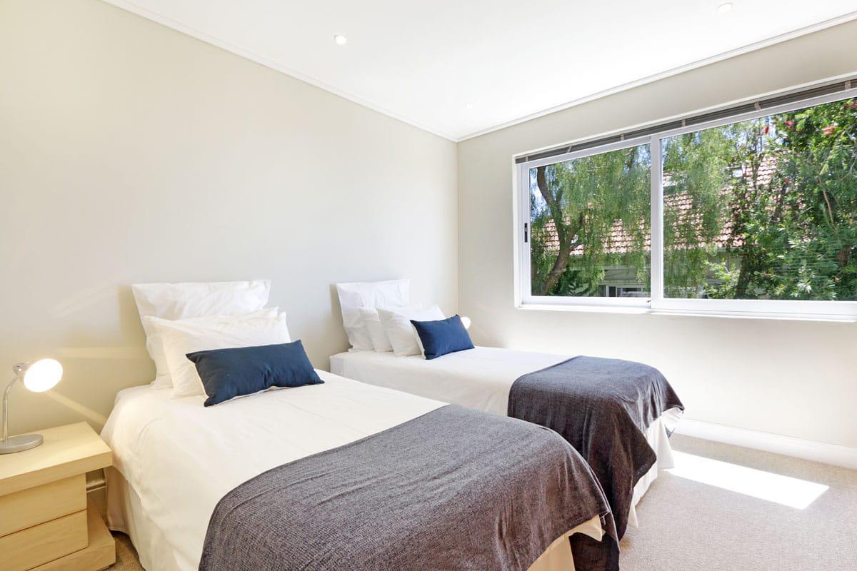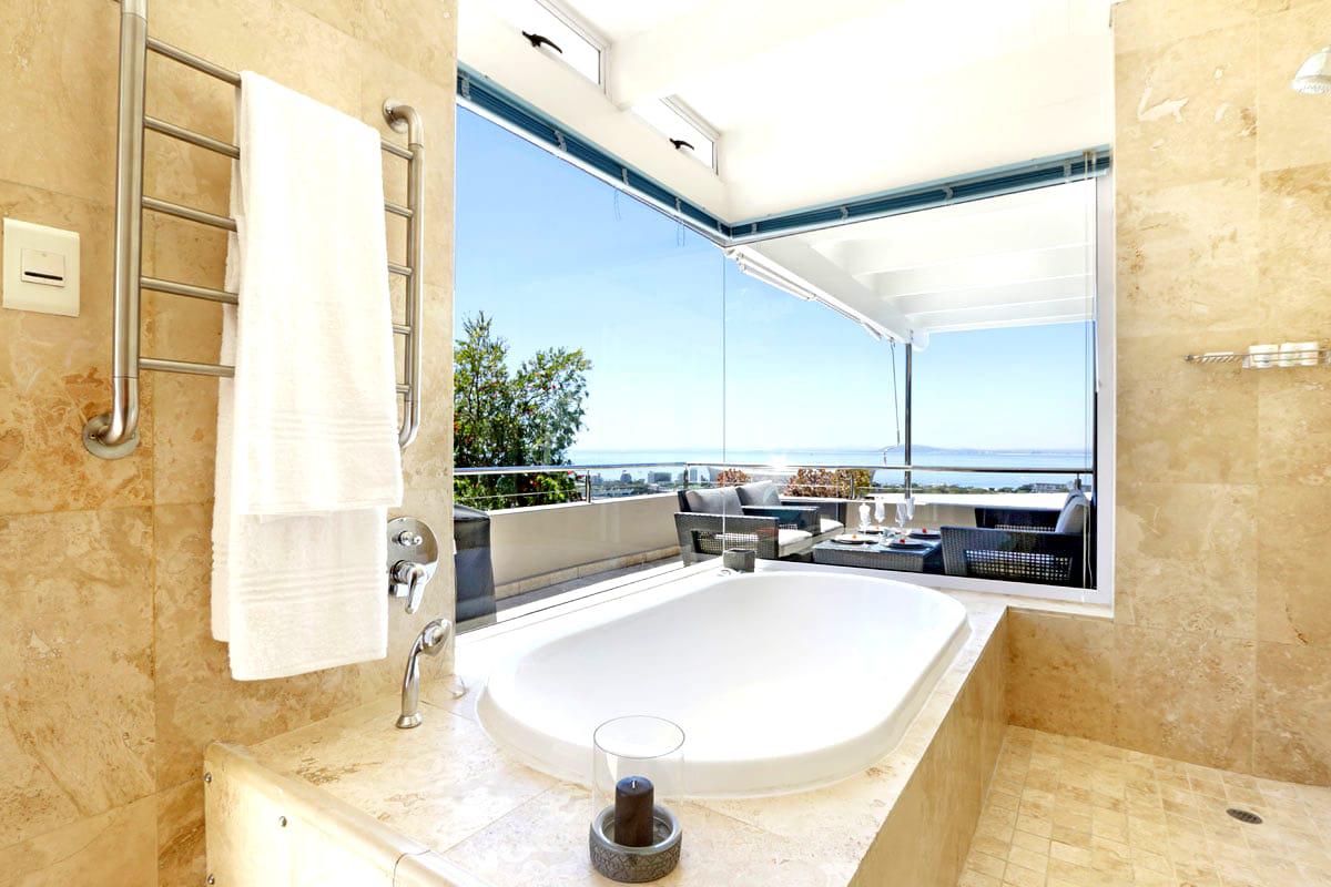 The master bedroom boasts a Queen-size bed and an open plan en-suite bathroom. As you soak in the tub you can admire the ocean views, or simply step outside onto the balcony. The second bedroom has twin beds and a separate bathroom with a shower.