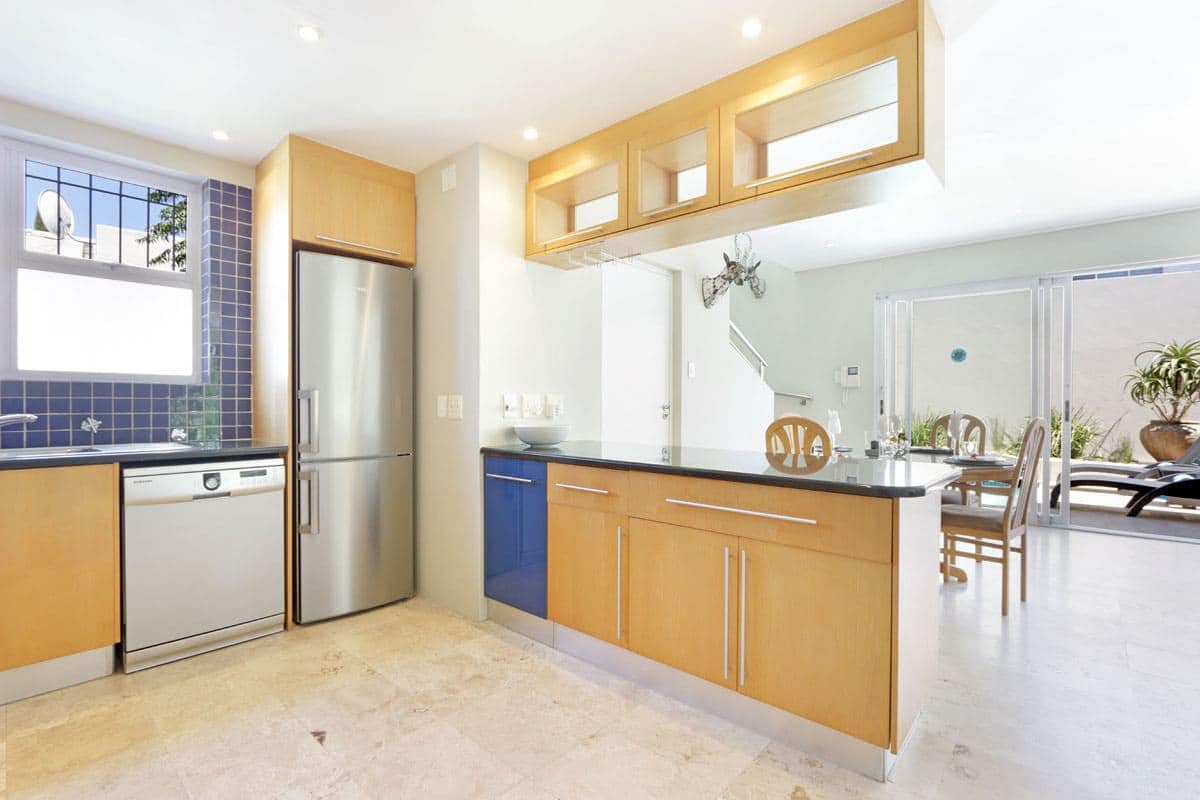 Kitchen opens onto patio with pool