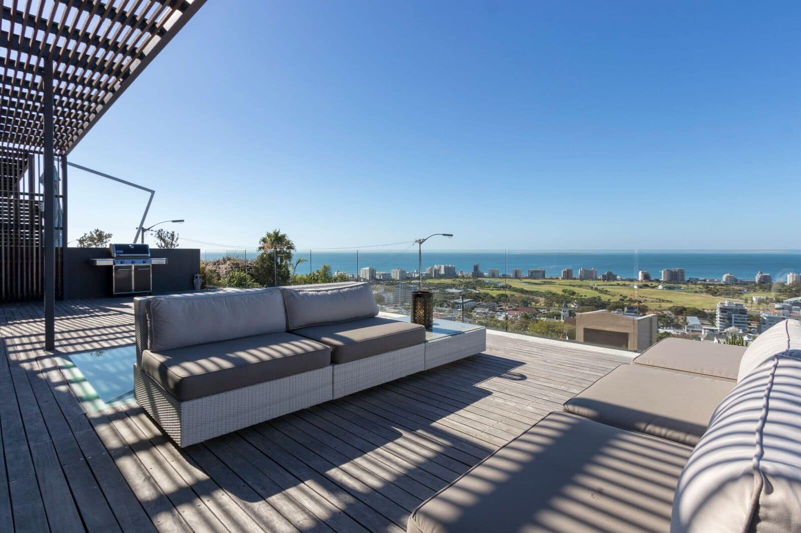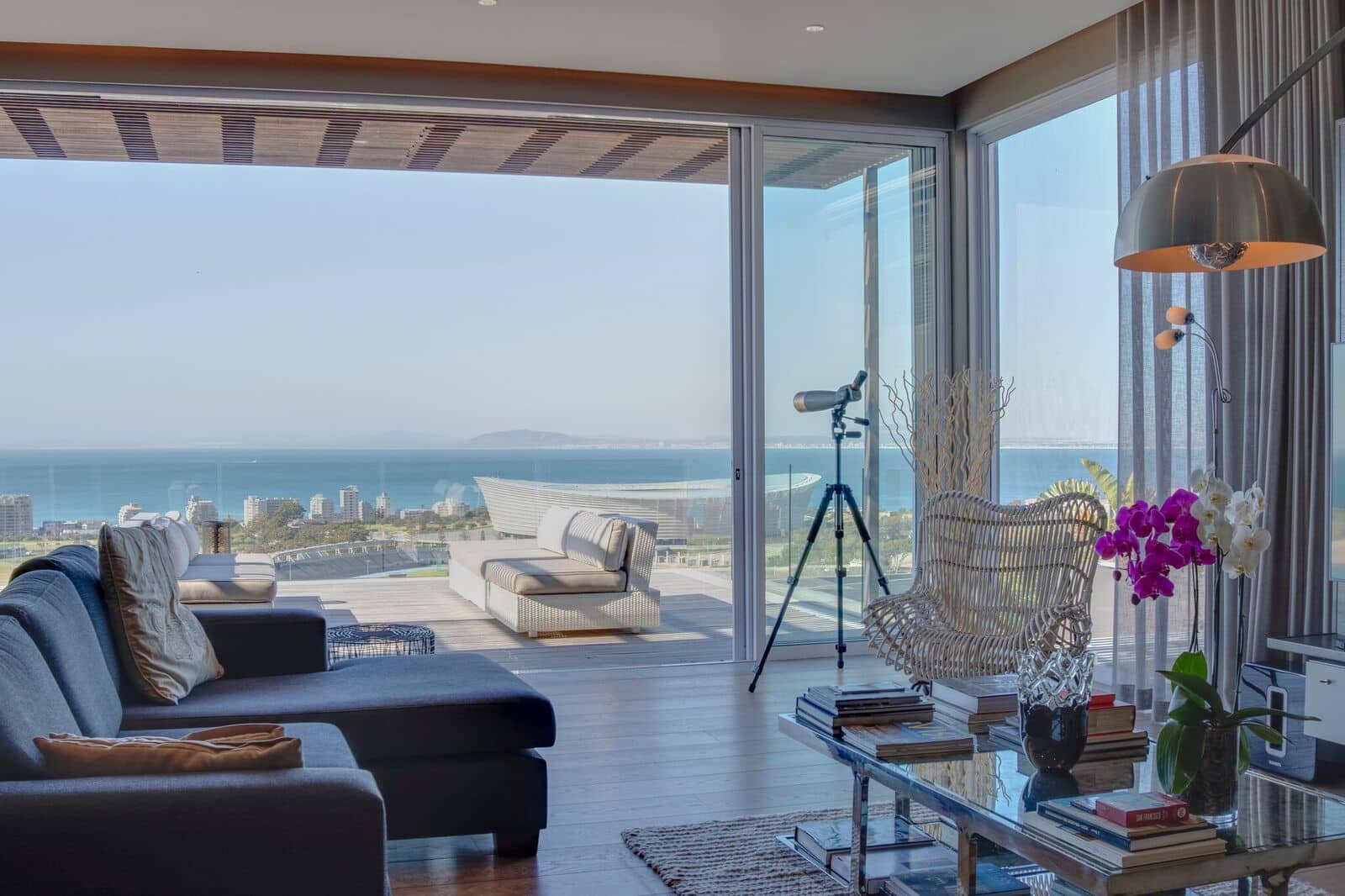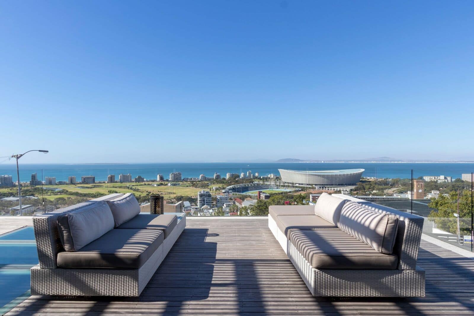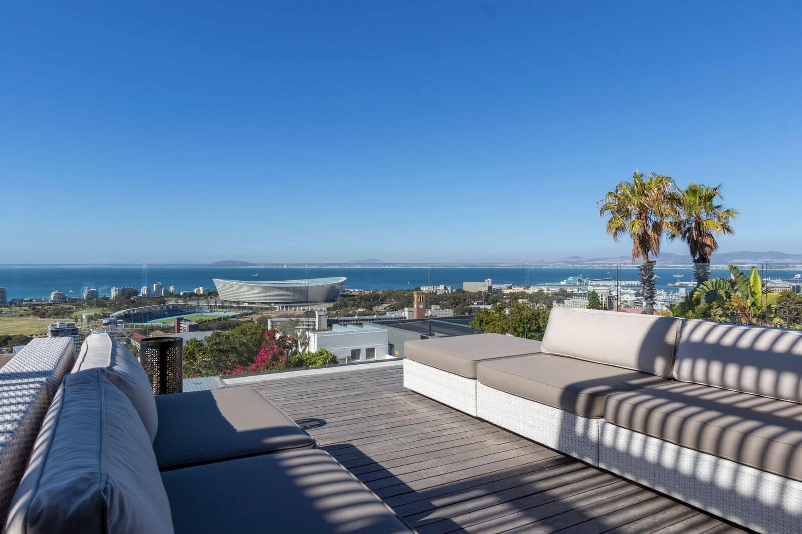 Experience the art of living in this opulent, stylish and open plan 3 bedroom villa, on the peak in trendy Green Point. Sensational sweeping views over the ocean are a perfect backdrop to this extraordinary urban locale. Count the clouds by day or the stars at night, as you float away in your private outdoor heated pool. If you must drag yourself off by the lure of local attractions…explore the cosmopolitan V&A Waterfront, gorgeous beaches, Green Point Park, Stadium and the most decadent eateries only minutes away.