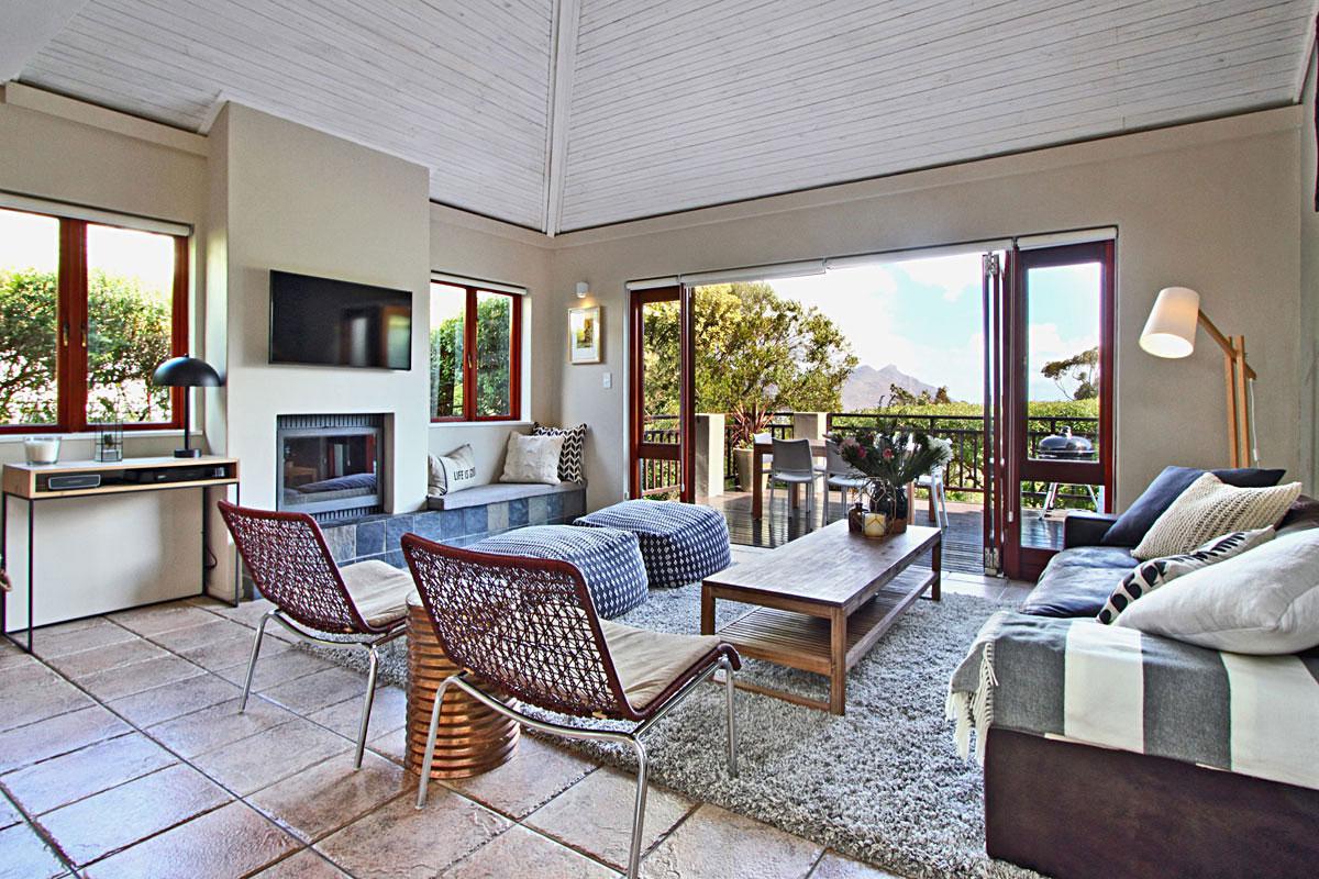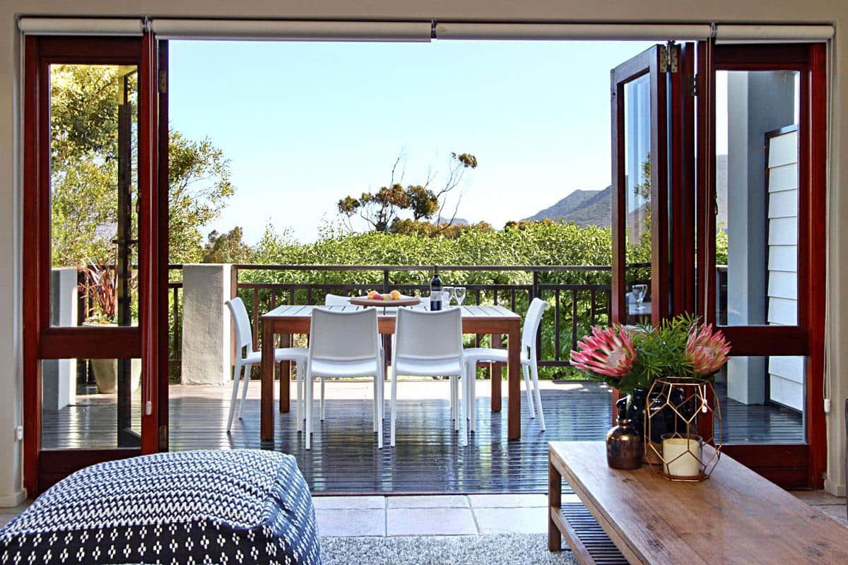 Set in the upscale Ruyteplaats complex with beautiful sweeping views over Hout Bay and the ocean, the property features two bedrooms, an open plan kitchen and living area and wide wooden deck and is surrounded by lush, landscaped gardens.