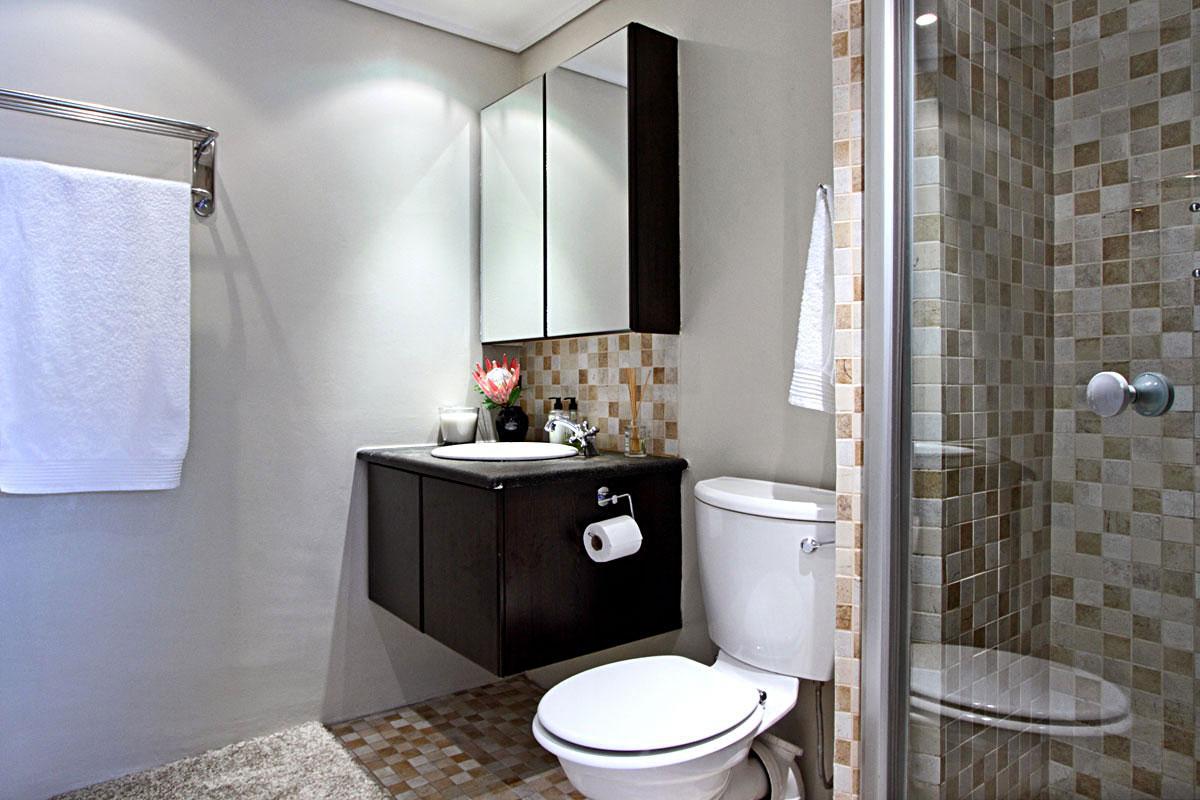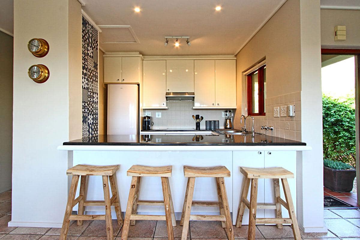 The bedrooms are bright and airy, with ample cupboard space, electric fans and fresh linens. The master bedroom features a queen-size bed and opens out onto a sheltered patio garden complete with benches while the second bedroom has two twin beds and lovely garden views. Both bedrooms share a separate bathroom with toilet, basin and shower.
