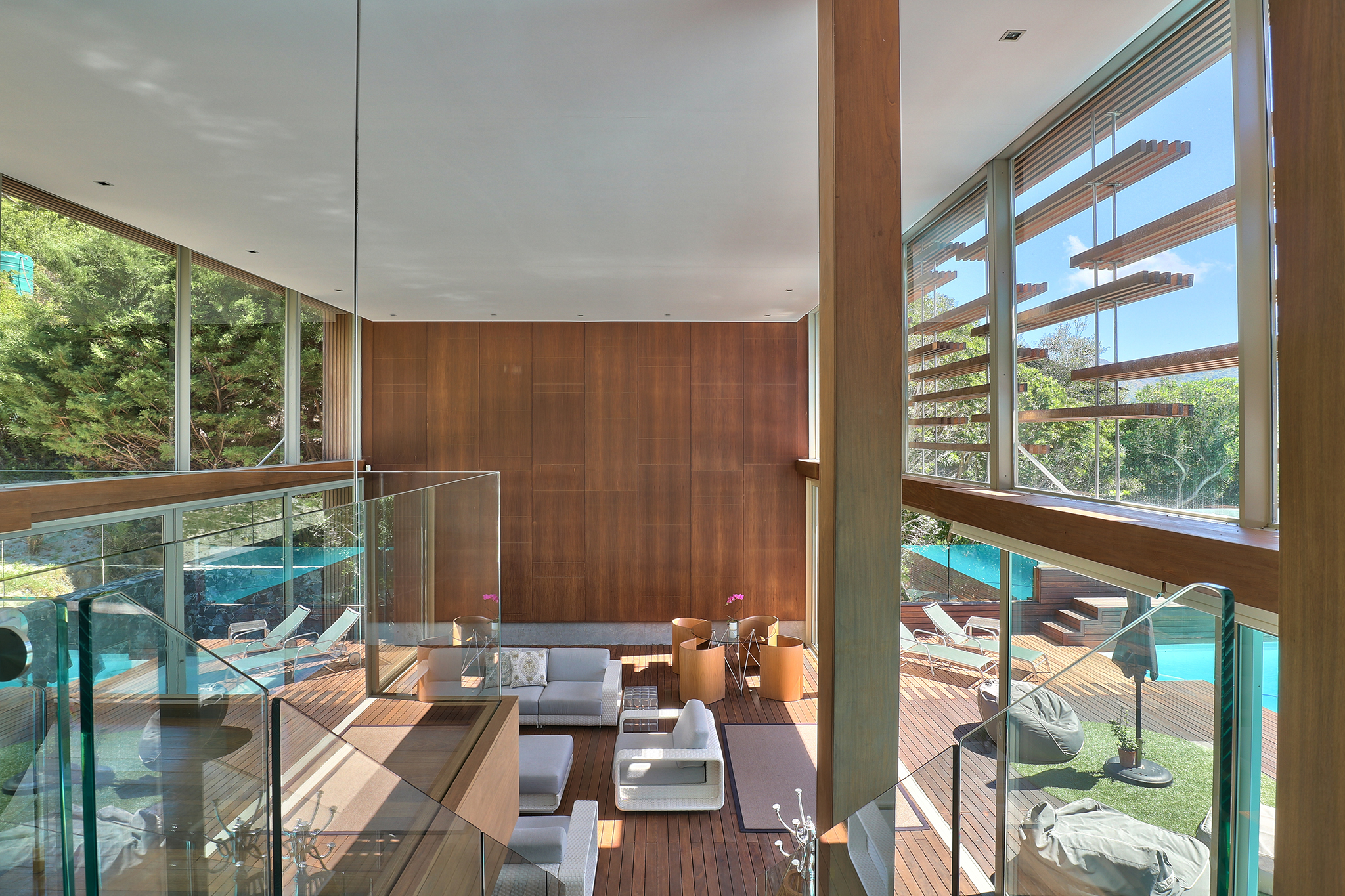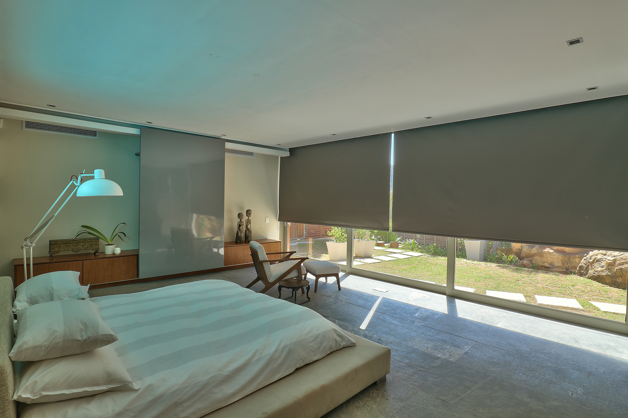 Minimally furnished with a king-sized bed dressed in crisp white bed linen, the en suite master bedroom is a sophisticated and sensual abode. Floor-to-ceiling glass sliding doors open onto a private balcony overlooking the manicured garden and turquoise infinity pool.