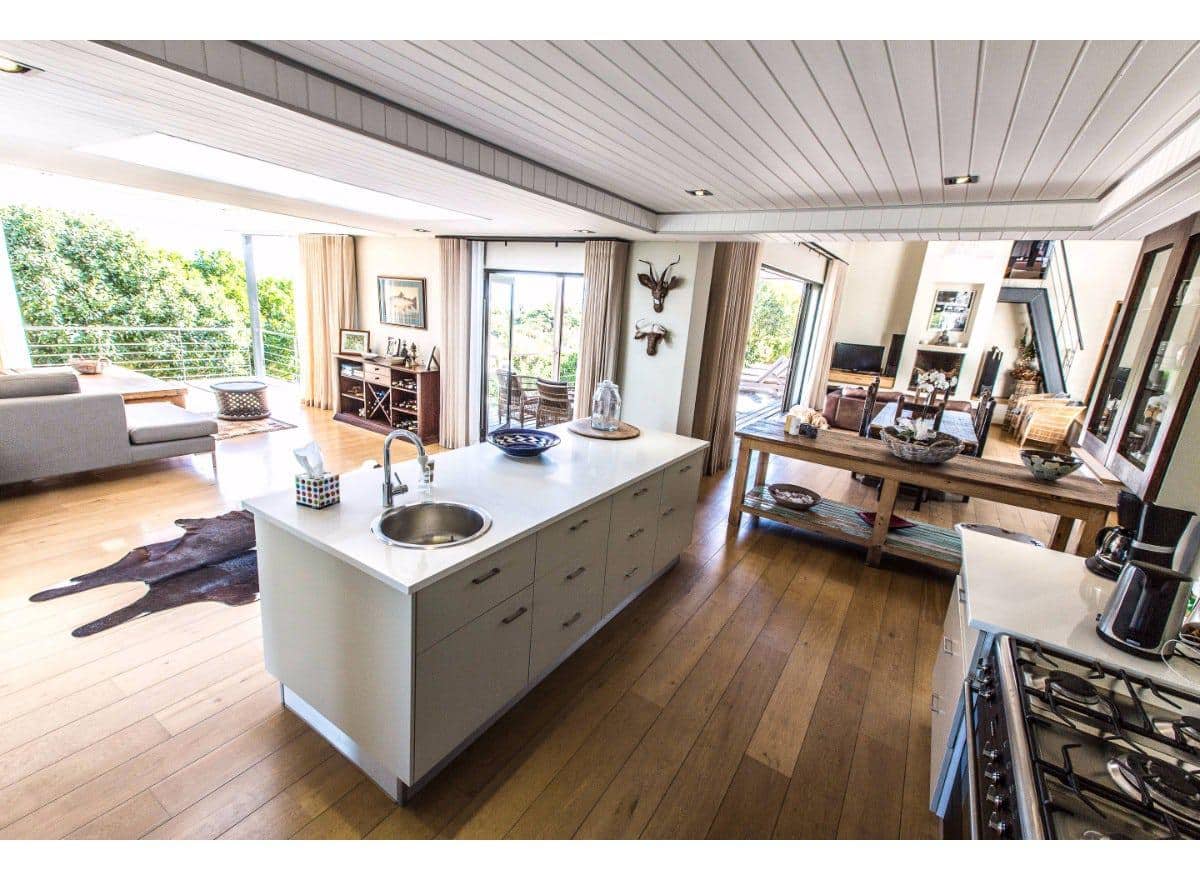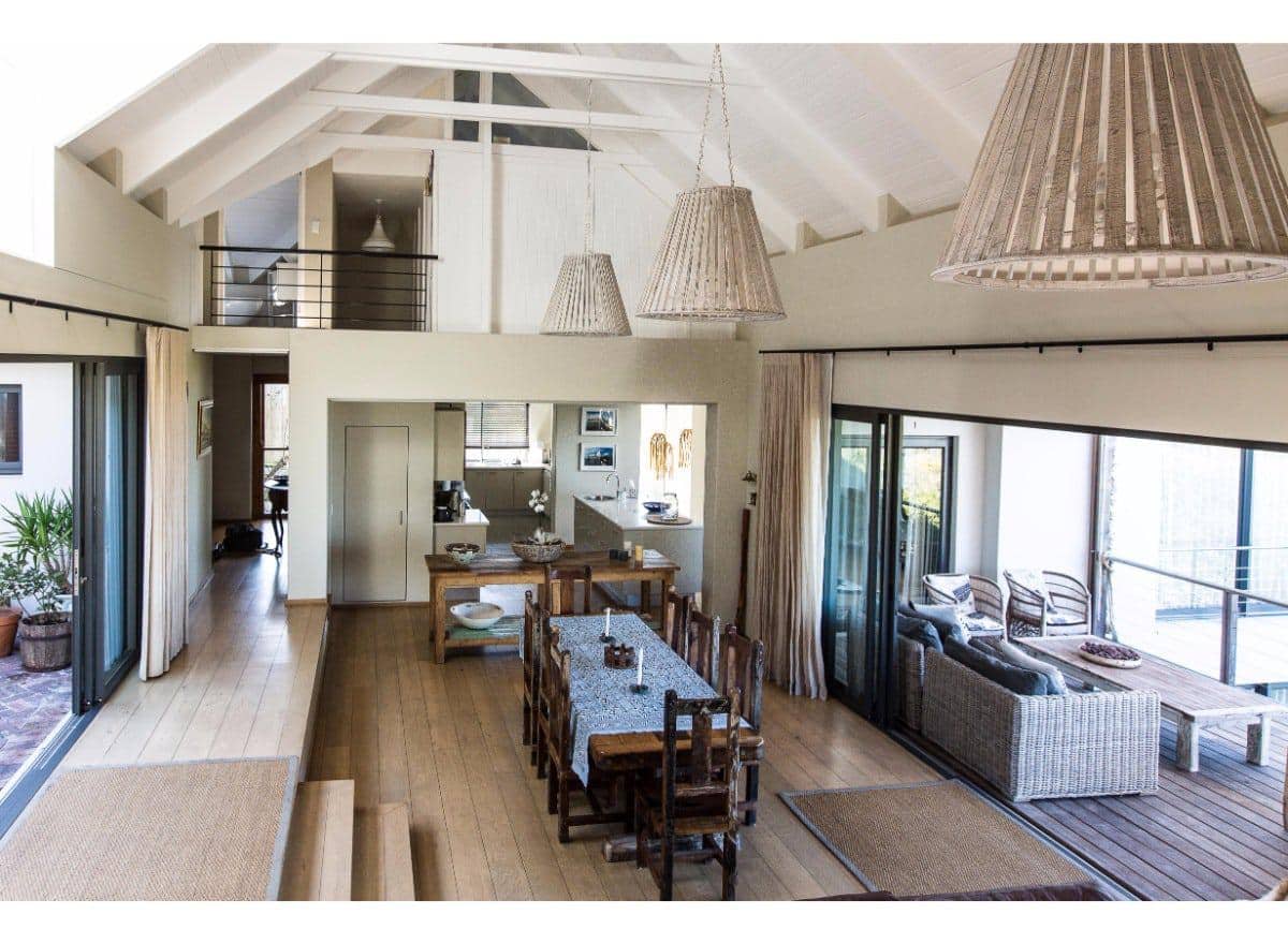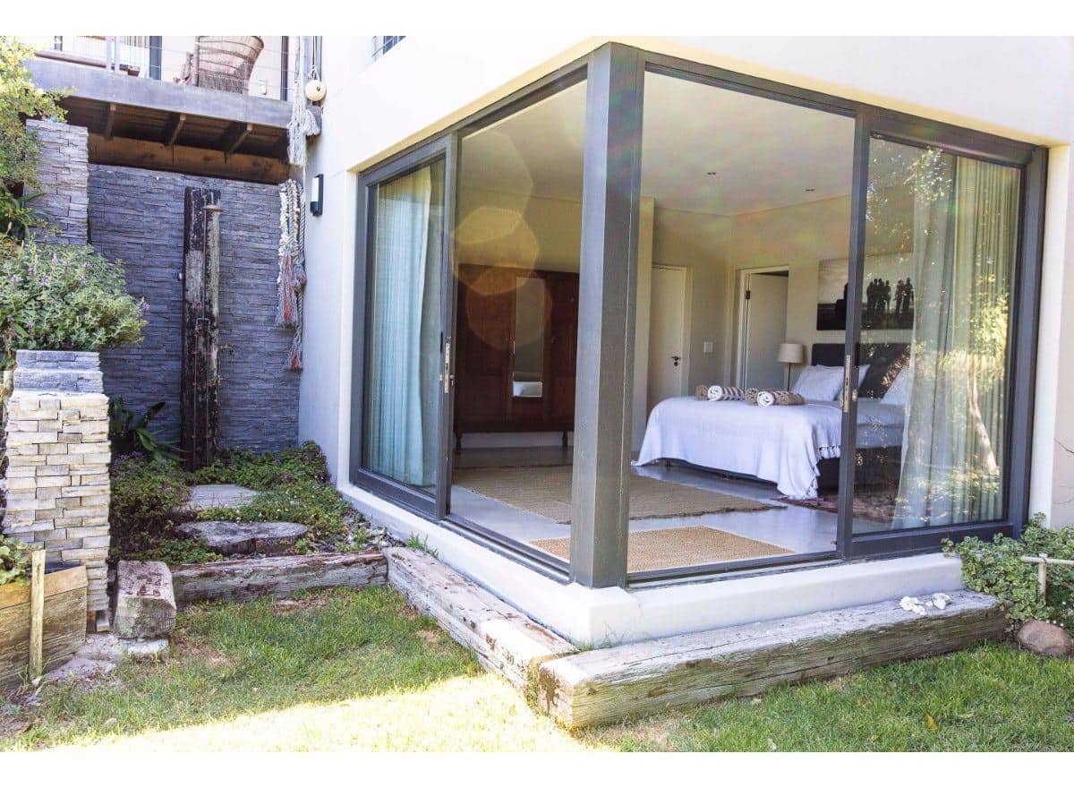 The living and dining area is all open plan, with a large self-catering kitchen at one end of the room, a dining room with seating for 8 guests in the middle and a TV lounge with a leather couch and wood-burning fireplace at the far end. Sliding doors provide outdoor access on both sides of the room, one side opens onto a sheltered courtyard, perfect for enjoying your morning coffee, whilst the other side has a patio lounge, sun loungers and steps which lead down to the garden and swimming pool.