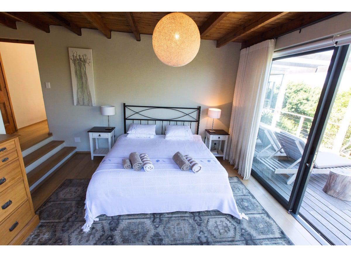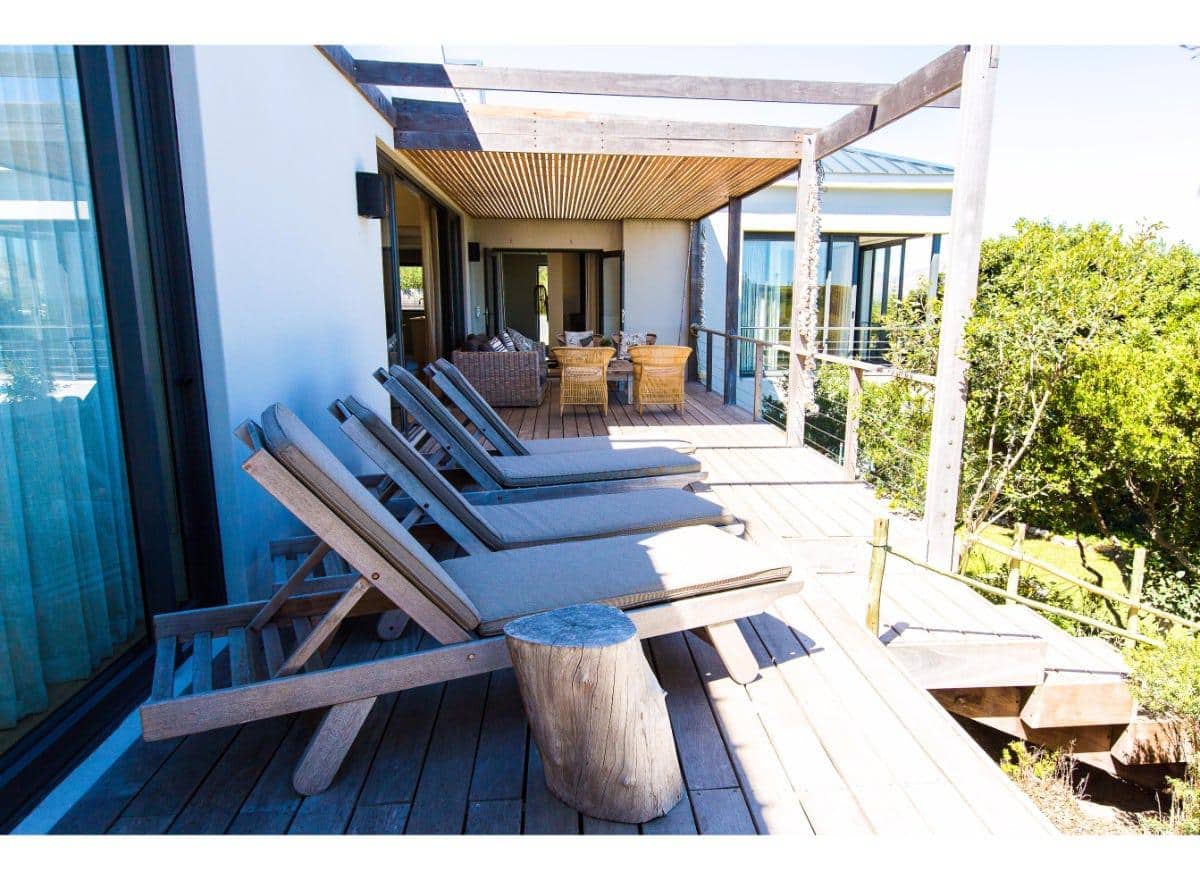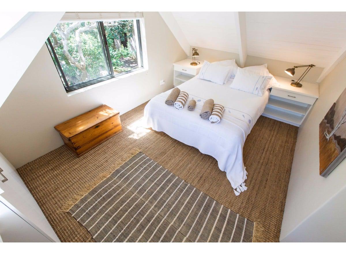 The living and dining area is all open plan, with a large self-catering kitchen at one end of the room, a dining room with seating for 8 guests in the middle and a TV lounge with a leather couch and wood-burning fireplace at the far end. Sliding doors provide outdoor access on both sides of the room, one side opens onto a sheltered courtyard, perfect for enjoying your morning coffee, whilst the other side has a patio lounge, sun loungers and steps which lead down to the garden and swimming pool.
